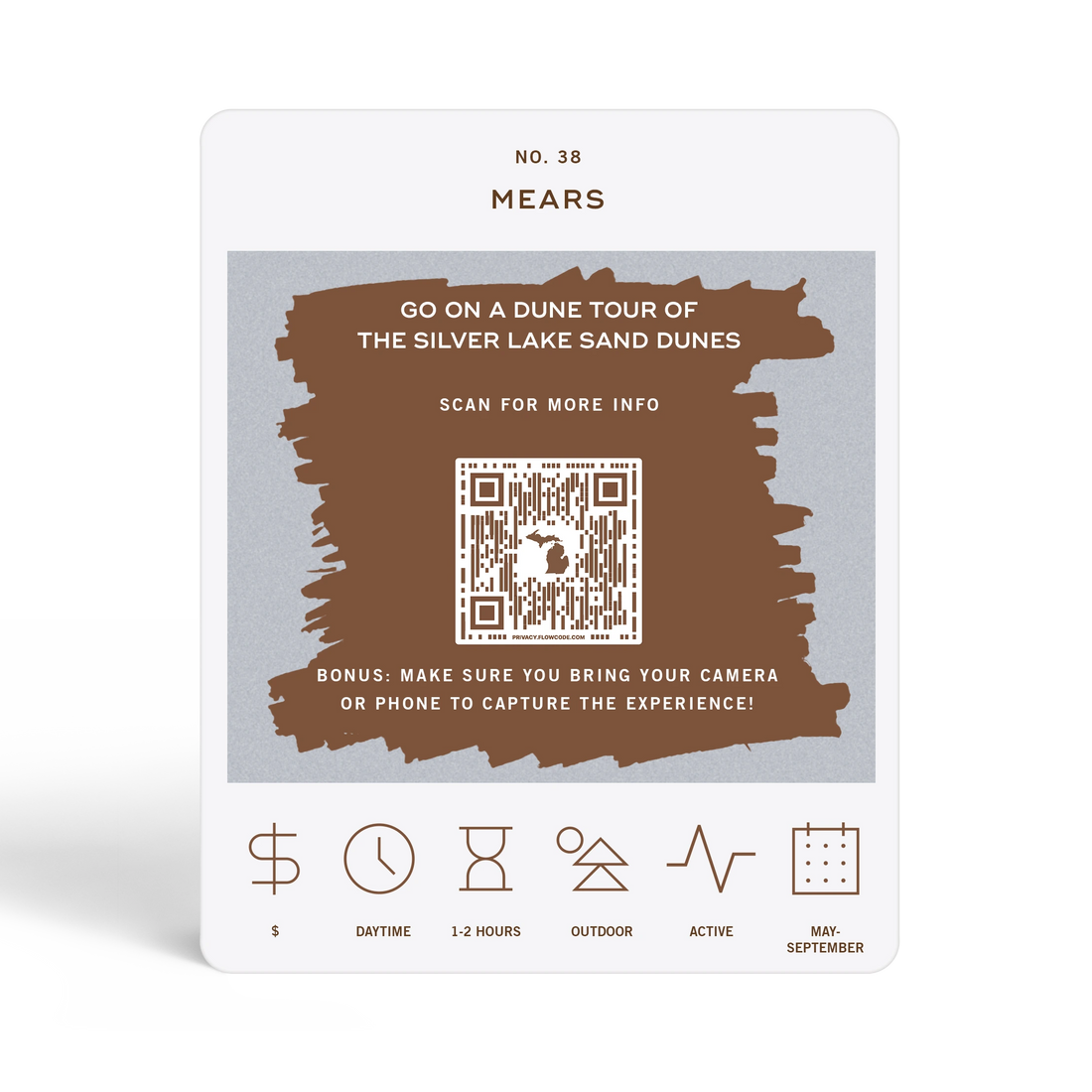 Each adventure card in the Michigan Adventure Bucket List has a hidden QR code that can be scanned using a smartphone camera. The QR code will lead you to a page on our website that offers additional information and links for the adventure, including maps and any other resources that might be helpful for planning and completing the activity. While the QR code is not required to complete the adventure, it can be a useful supplement for those who want more information or guidance.