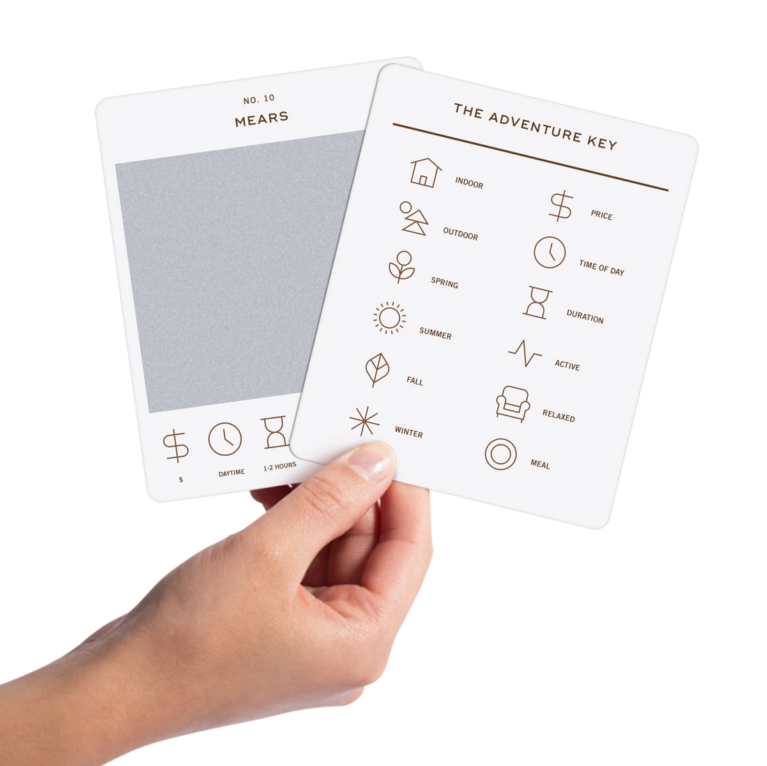 50 scratch off bucket list adventures around the state of Michigan. Pick a city that you want to explore, check out the icons at the bottom of the card to determine the season, cost, and time of day, and then scratch off the card to reveal your adventure!