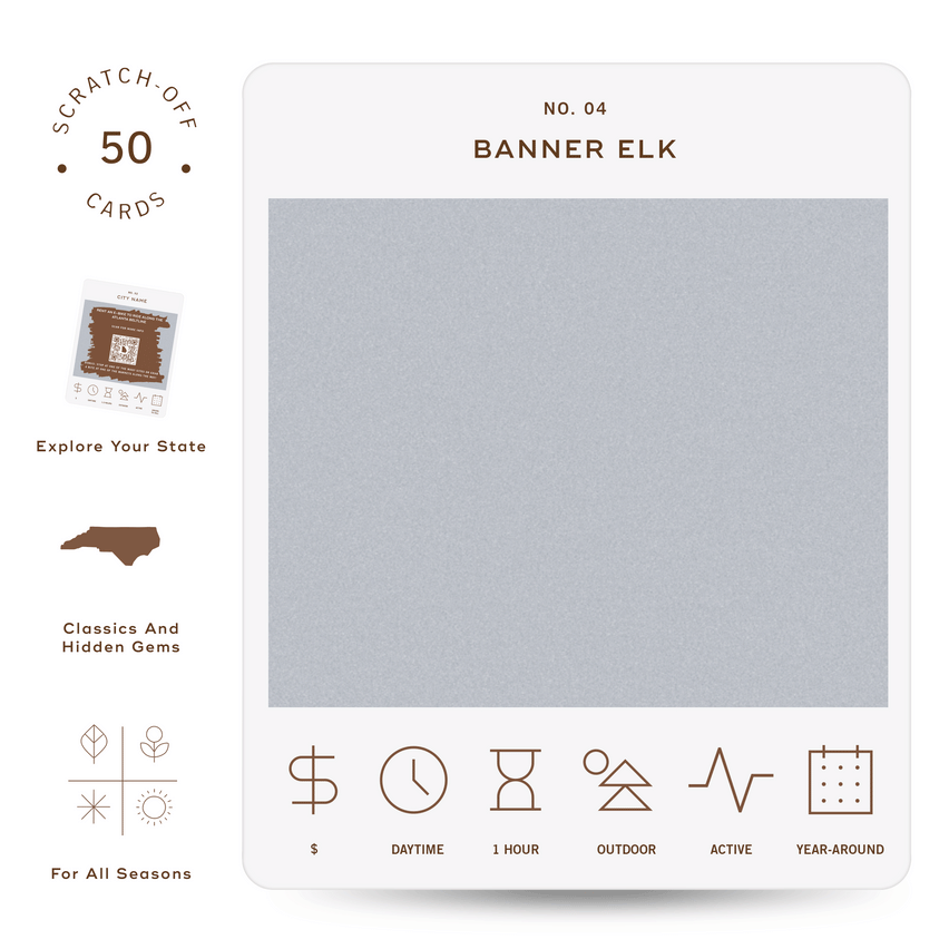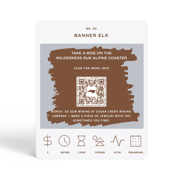 The North Carolina Adventure Bucket List is a deck of 50 cards, each featuring a unique adventure within the state. Each card is labeled with the name of a city or county to indicate where the adventure takes place. At the bottom of each card, there are icons that provide additional details about the adventure, including its price range, duration, recommended time of day, and season. To discover the adventure, simply scratch off the card. If you want more information about the activity, scan the QR code on the card with your phone. This will take you to a website where you can learn more about the adventure and get tips on how to make the most of your experience.