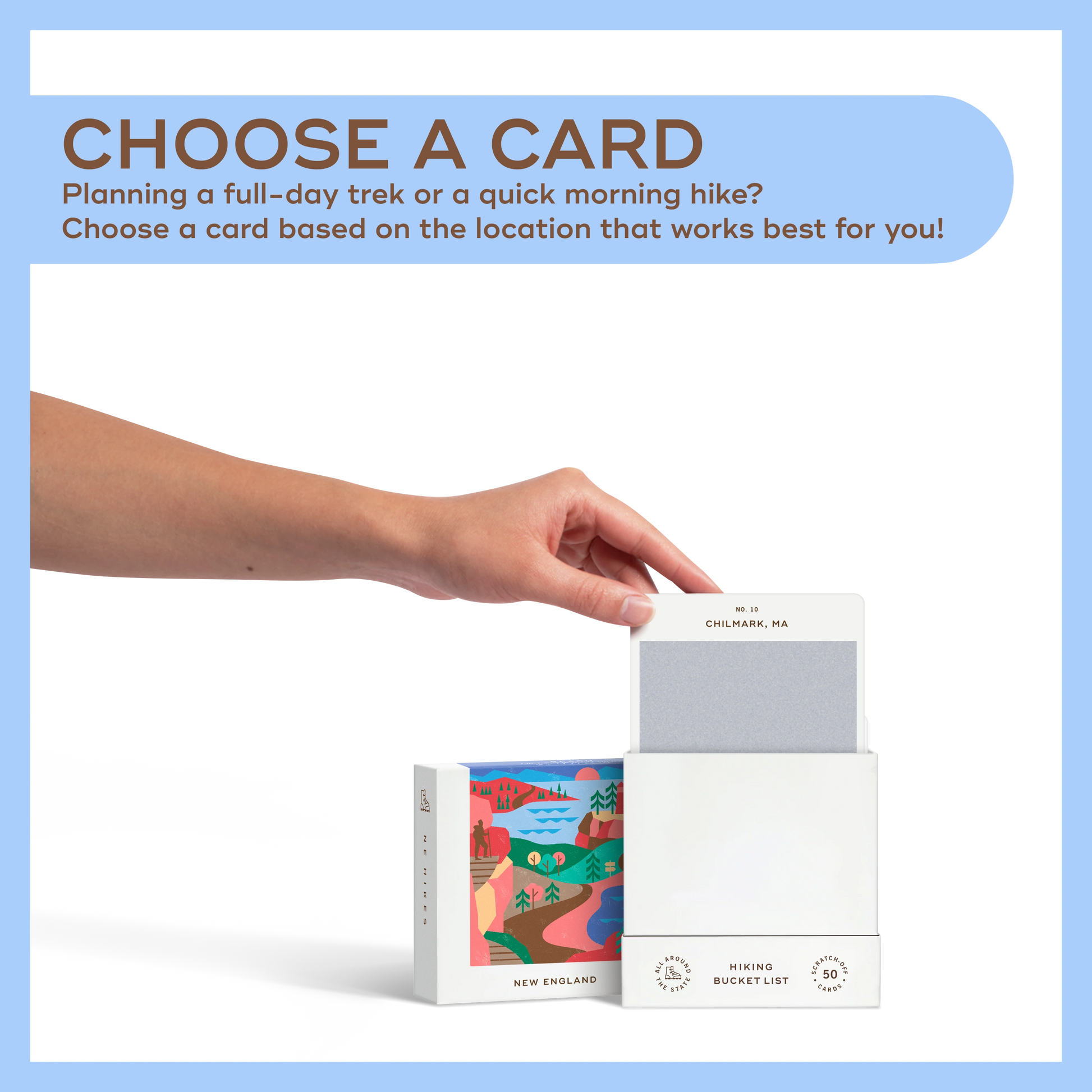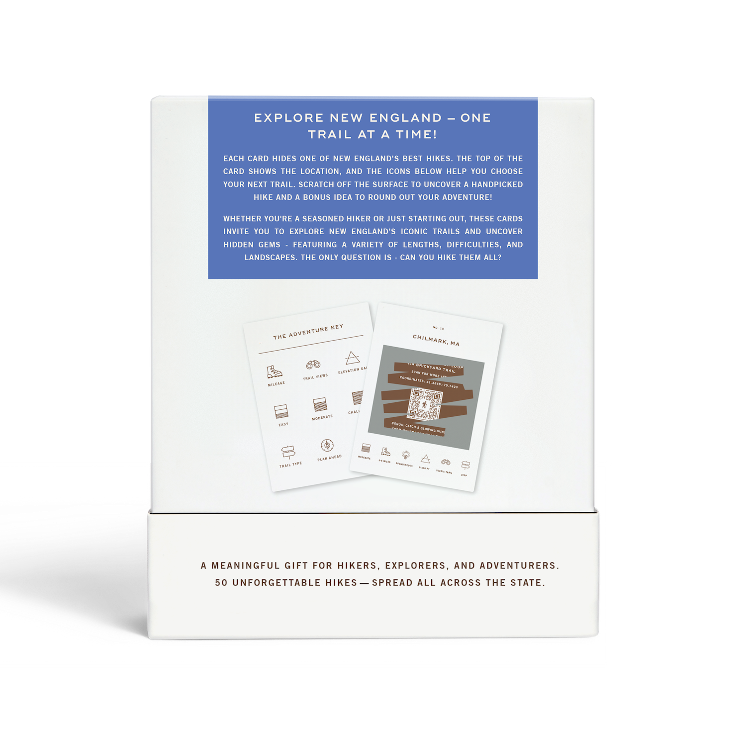 The New England Hiking Bucket List has hikes all around the region. Each card has an area name at the top, and when you scratch it off, you reveal your adventure!