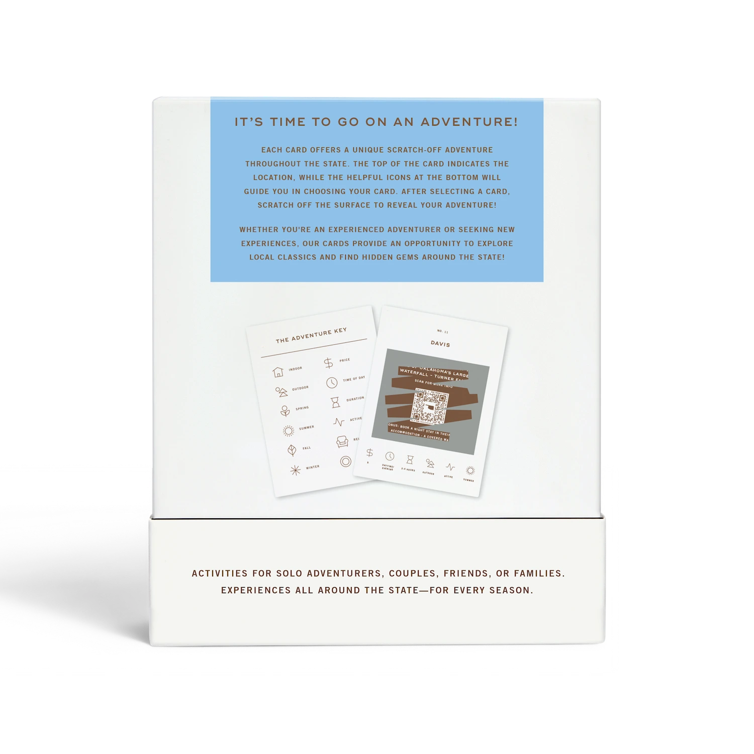 50 scratch off bucket list adventures around the state of Oklahoma. Pick a city that you want to explore, check out the icons at the bottom of the card to determine the season, cost, and time of day, and then scratch off the card to reveal your adventure!
