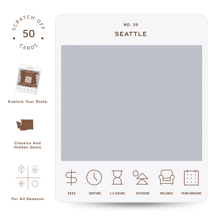 50 scratch off bucket list adventures around the state of Washington. Pick a city that you want to explore, check out the icons at the bottom of the card to determine the season, cost, and time of day, and then scratch off the card to reveal your adventure!