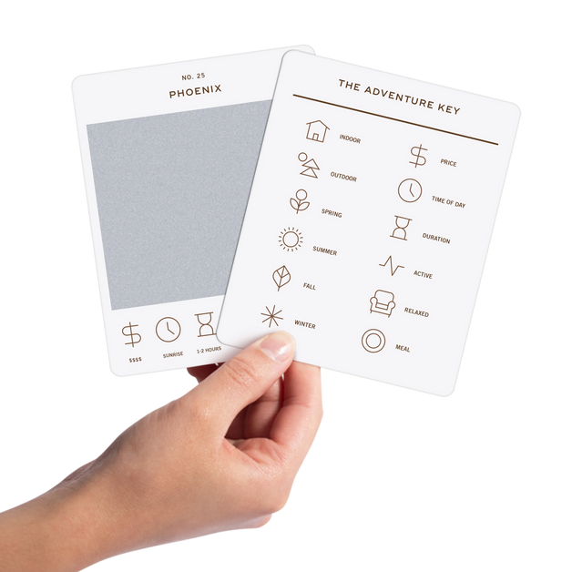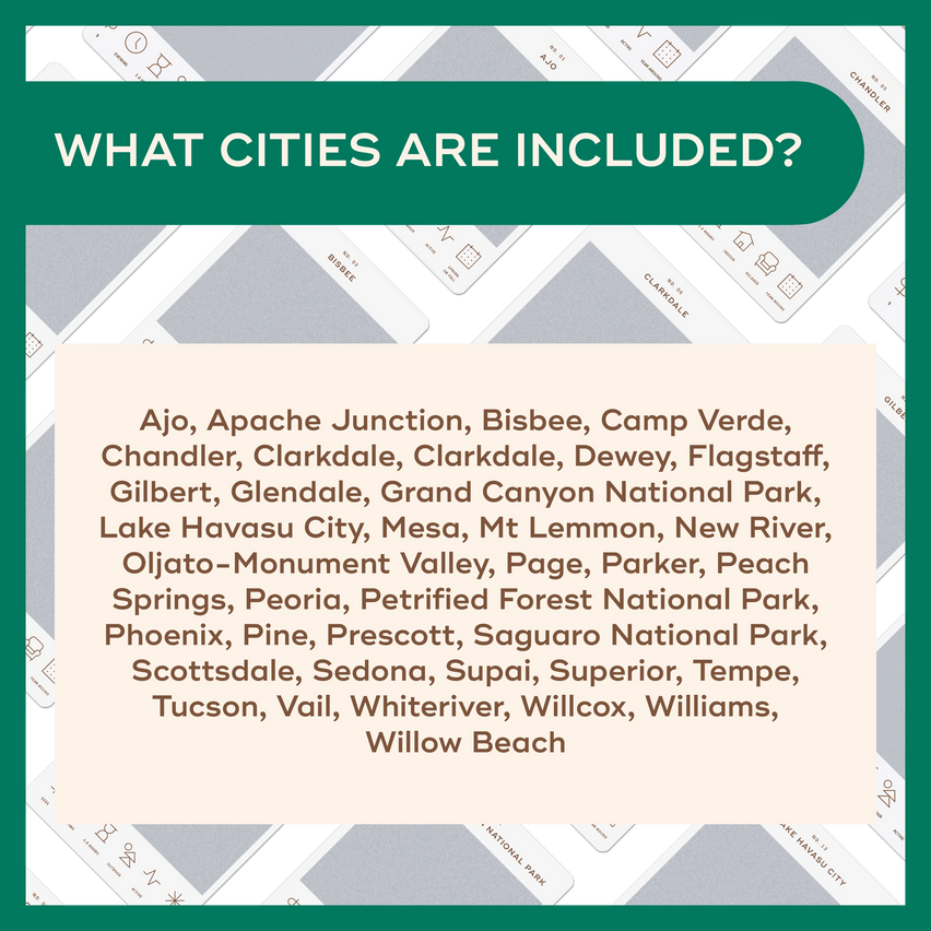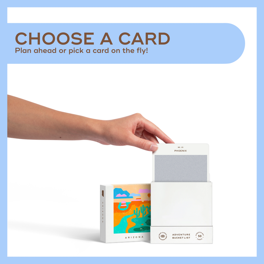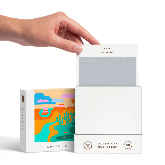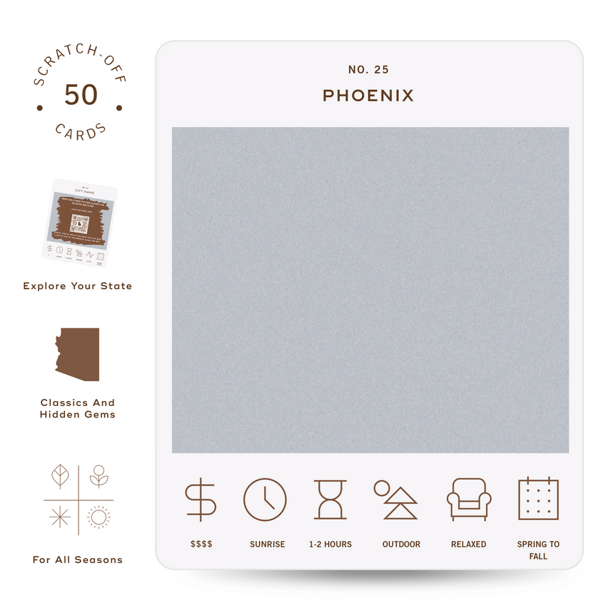 50 scratch off bucket list adventures around the state of Arizona. Pick a city that you want to explore, check out the icons at the bottom of the card to determine the season, cost, and time of day, and then scratch off the card to reveal your adventure!