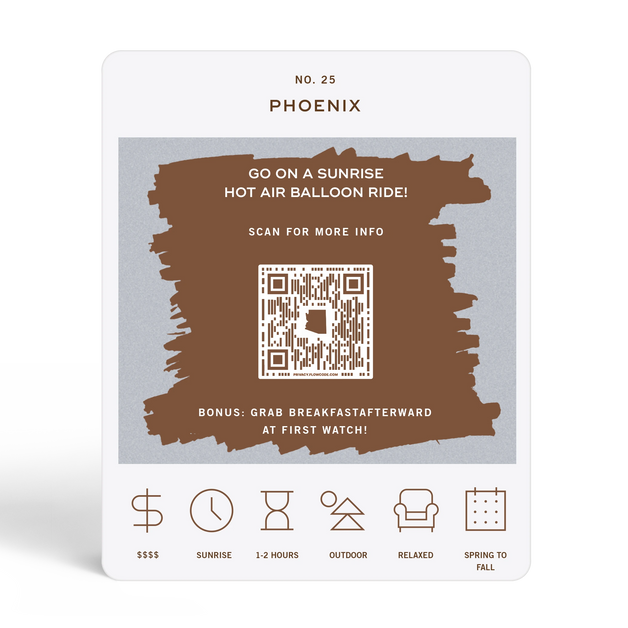 The Arizona Adventure Bucket List is a deck of 50 cards, each featuring a unique adventure within the state. Each card is labeled with the name of a city or county to indicate where the adventure takes place. At the bottom of each card, there are icons that provide additional details about the adventure, including its price range, duration, recommended time of day, and season. To discover the adventure, simply scratch off the card. If you want more information about the activity, scan the QR code on the card with your phone. This will take you to a website where you can learn more about the adventure and get tips on how to make the most of your experience.