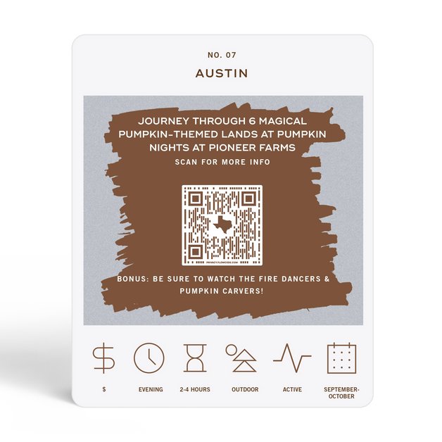 The Austin Adventure Bucket List is a deck of 50 cards, each featuring a unique adventure within the state. Each card is labeled with the name of a city or county to indicate where the adventure takes place. At the bottom of each card, there are icons that provide additional details about the adventure, including its price range, duration, recommended time of day, and season. To discover the adventure, simply scratch off the card. If you want more information about the activity, scan the QR code on the card with your phone. This will take you to a website where you can learn more about the adventure and get tips on how to make the most of your experience.