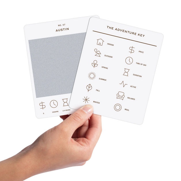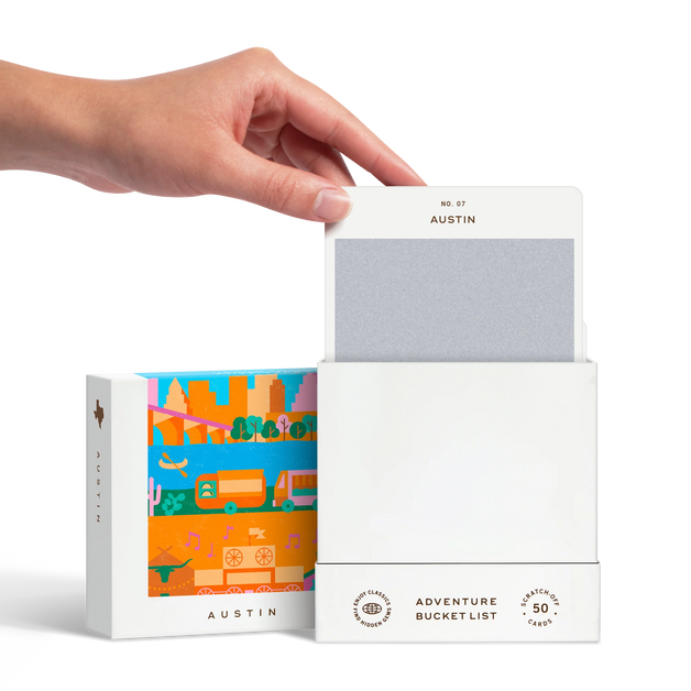 50 scratch off bucket list adventures all within one hour of the city of Austin. Pick an area of the city that you want to explore, check out the icons at the bottom of the card to determine the season, cost, and time of day, and then scratch off the card to reveal your adventure!
