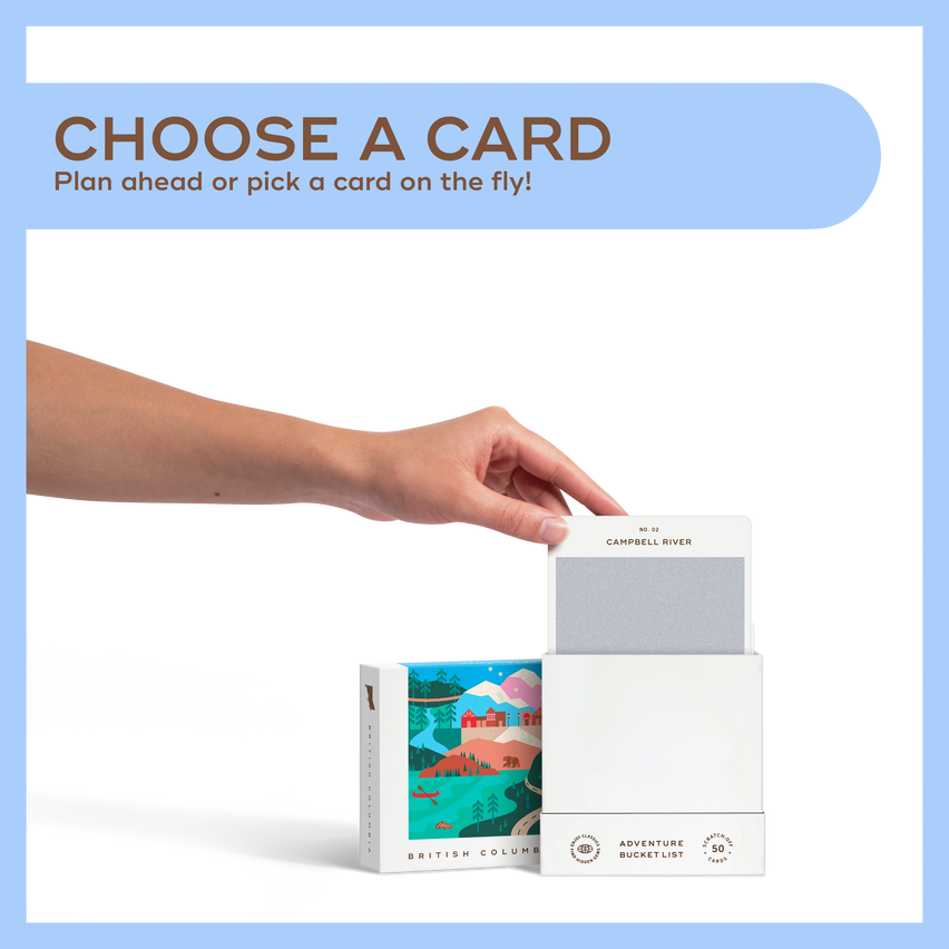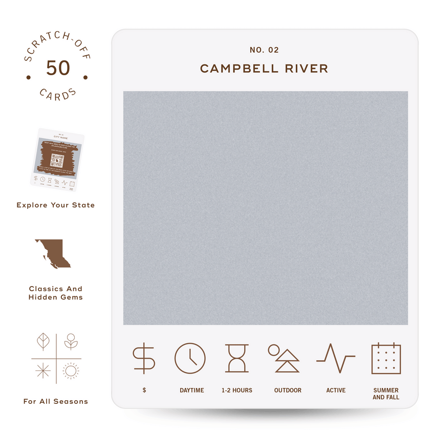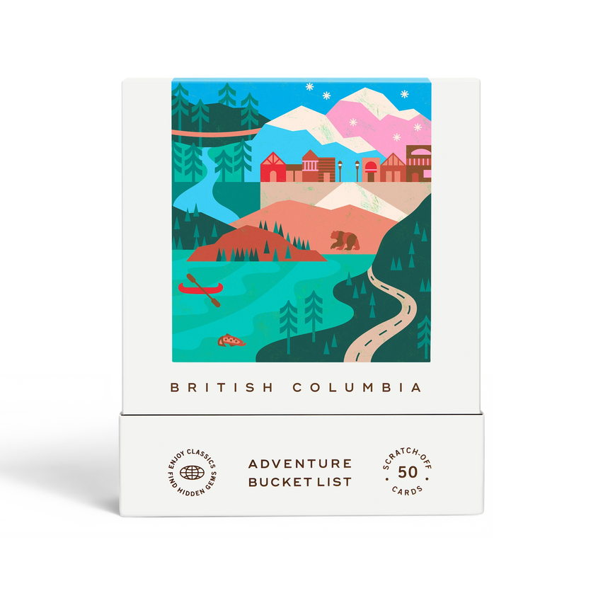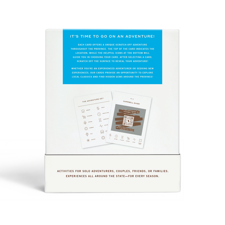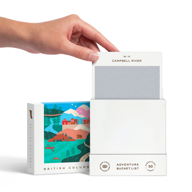 50 scratch-off bucket list adventures around the province of British Columbia. Pick an area that you want to explore, check out the icons at the bottom of the card to determine the season, cost, and time of day, and then scratch off the card to reveal your adventure!