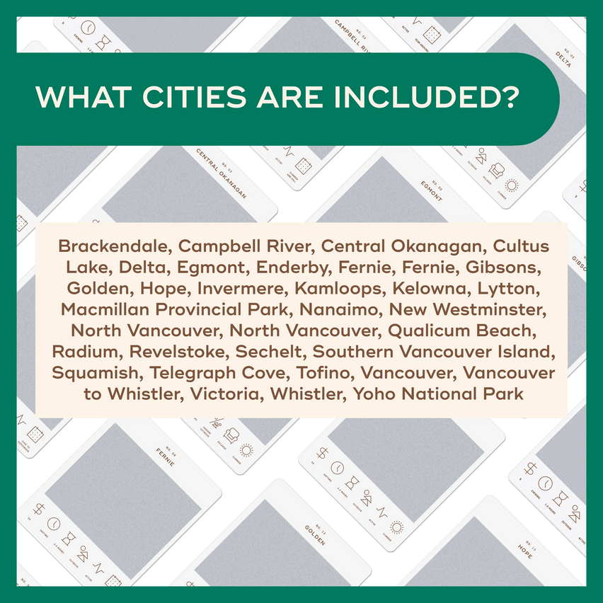 Brackendale, Campbell River, Central Okanagan, Cultus Lake, Delta, Egmont, Enderby, Fernie, Fernie, Gibsons, Golden, Hope, Invermere, Kamloops, Kelowna, Lytton, Macmillan Provincial Park, Nanaimo, New Westminster, North Vancouver, North Vancouver, Qualicum Beach, Radium, Revelstoke, Sechelt, Southern Vancouver Island Squamish, Telegraph Cove, Tofino, Vancouver, Vancouver to Whistler, Victoria, Whistler and Yoho National Park. We don't have a card for every city, but we did try to get a wide variety!