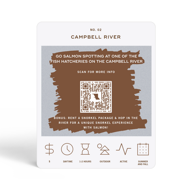 The British Columbia Adventure Bucket List is a deck of 50 cards, each featuring a unique adventure within the state. Each card is labeled with the name of a city or county to indicate where the adventure takes place. At the bottom of each card, there are icons that provide additional details about the adventure, including its price range, duration, recommended time of day, and season. To discover the adventure, simply scratch off the card. If you want more information about the activity, scan the QR code on the card with your phone. This will take you to a website where you can learn more about the adventure and get tips on how to make the most of your experience.
