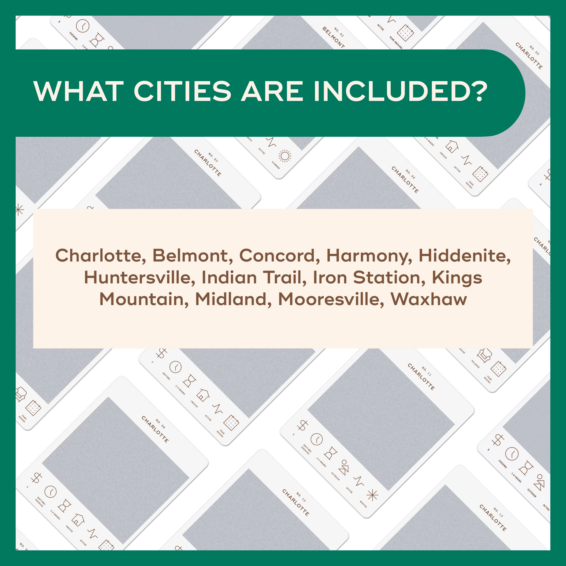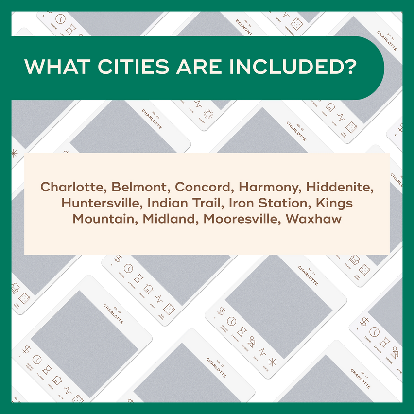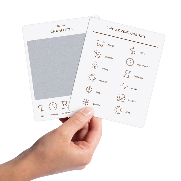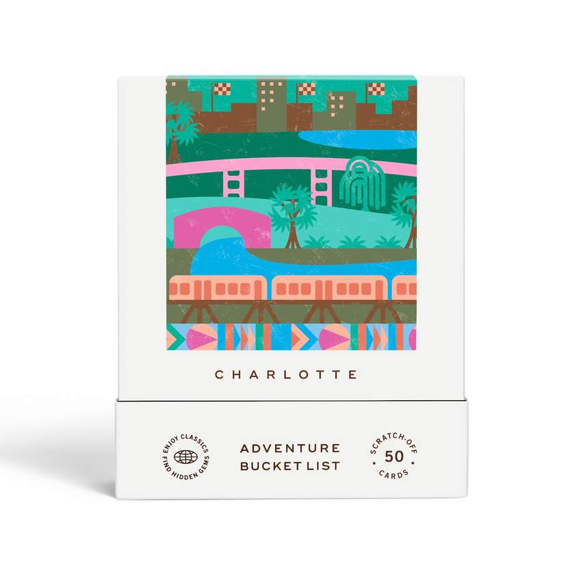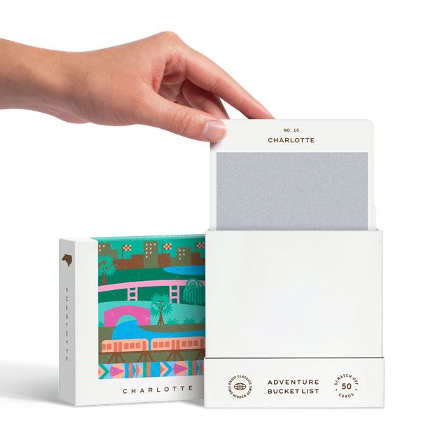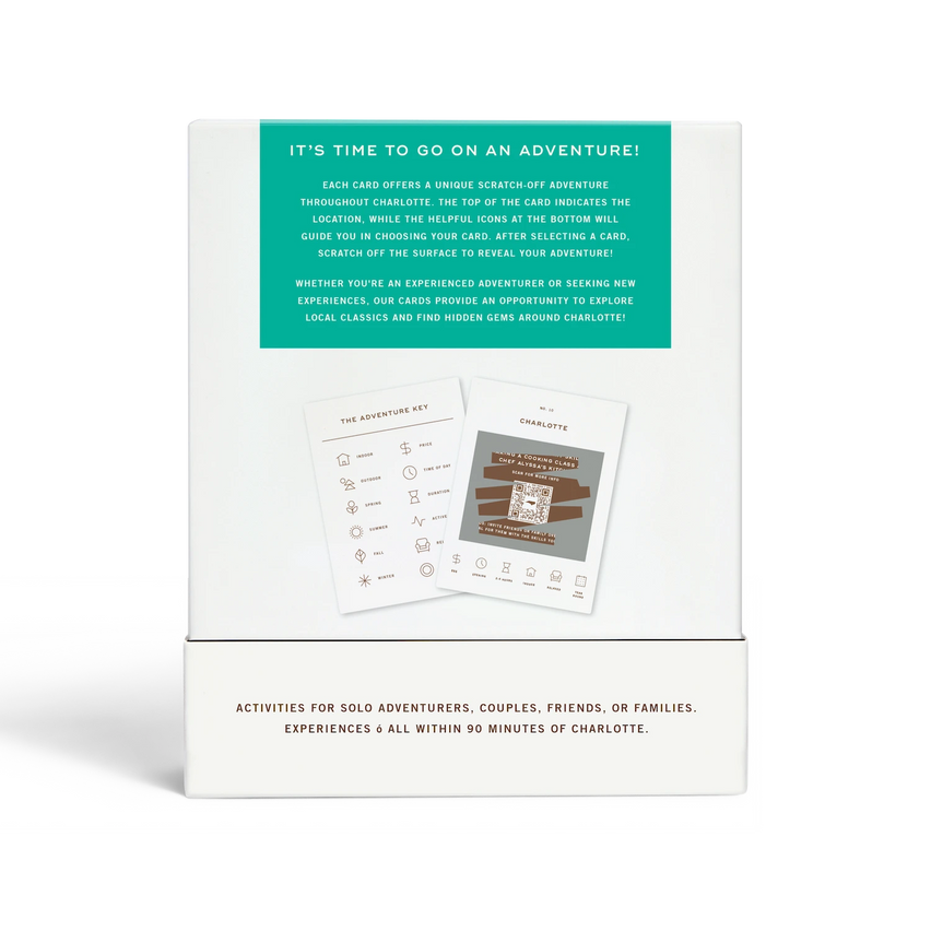 50 scratch off bucket list adventures all within one hour of the city of Charlotte. Pick an area of the city that you want to explore, check out the icons at the bottom of the card to determine the season, cost, and time of day, and then scratch off the card to reveal your adventure!
