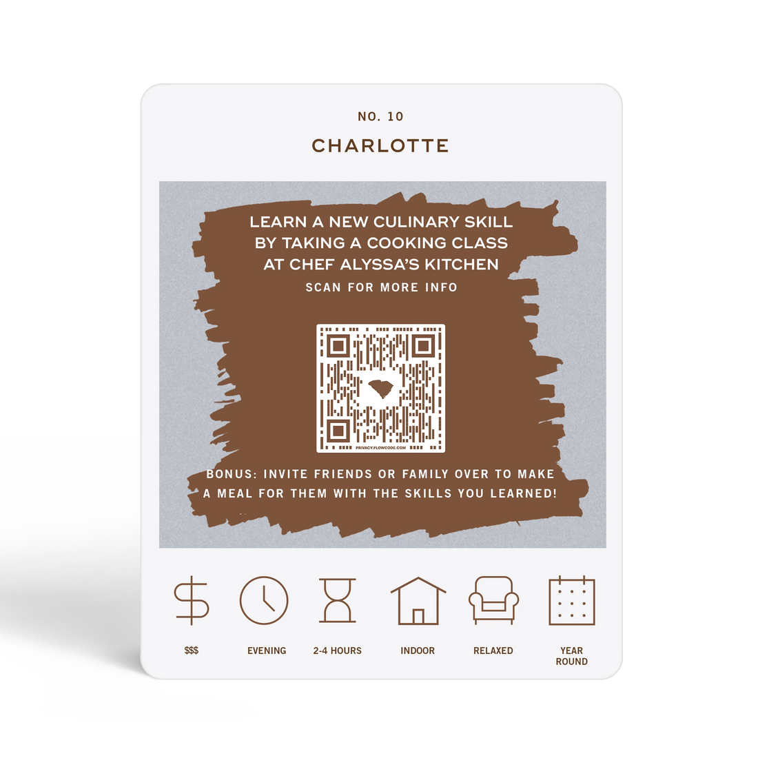 The Charlotte Adventure Bucket List is a deck of 50 cards, each featuring a unique adventure within the state. Each card is labeled with the name of a city or county to indicate where the adventure takes place. At the bottom of each card, there are icons that provide additional details about the adventure, including its price range, duration, recommended time of day, and season. To discover the adventure, simply scratch off the card. If you want more information about the activity, scan the QR code on the card with your phone. This will take you to a website where you can learn more about the adventure and get tips on how to make the most of your experience.