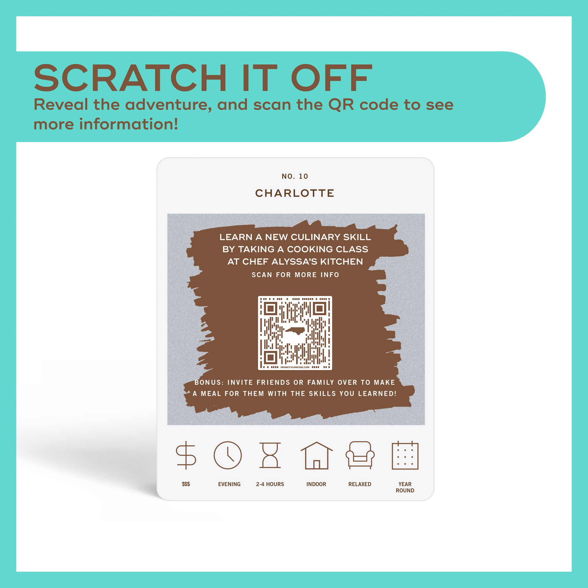 The Charlotte Adventure Bucket List is a deck of 50 cards, each featuring a unique adventure within the state. Each card is labeled with the name of a city or county to indicate where the adventure takes place. At the bottom of each card, there are icons that provide additional details about the adventure, including its price range, duration, recommended time of day, and season. To discover the adventure, simply scratch off the card. If you want more information about the activity, scan the QR code on the card with your phone. This will take you to a website where you can learn more about the adventure and get tips on how to make the most of your experience.