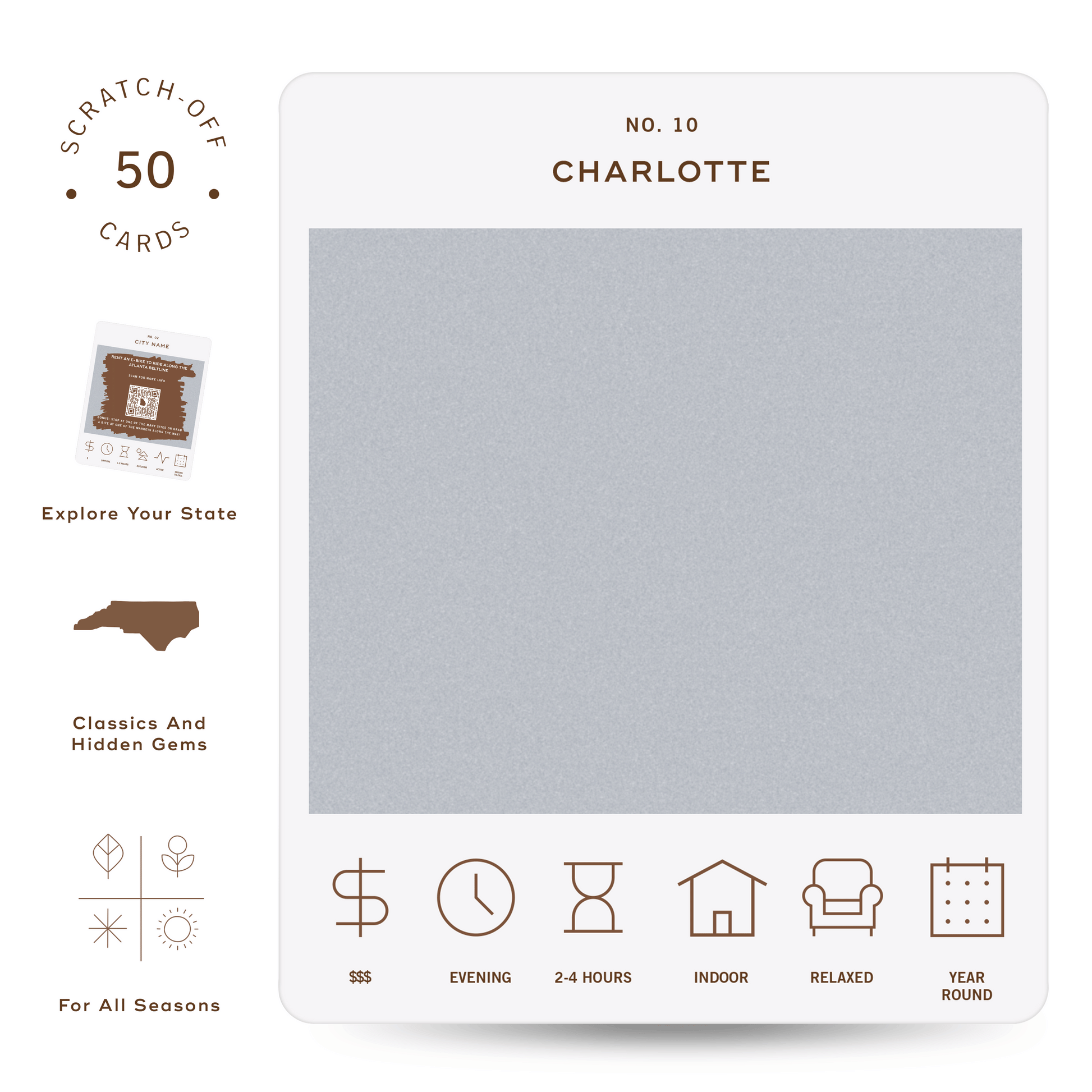 50 scratch off bucket list adventures all within one hour of the city of Charlotte. Pick an area of the city that you want to explore, check out the icons at the bottom of the card to determine the season, cost, and time of day, and then scratch off the card to reveal your adventure!