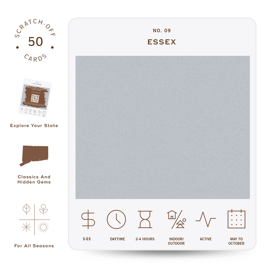 50 scratch off bucket list adventures around the state of Connecticut. Pick a city that you want to explore, check out the icons at the bottom of the card to determine the season, cost, and time of day, and then scratch off the card to reveal your adventure!