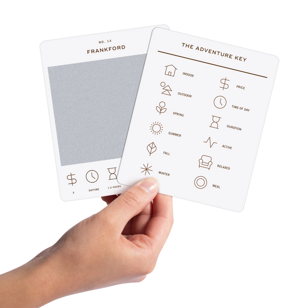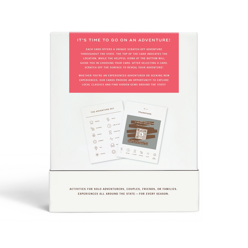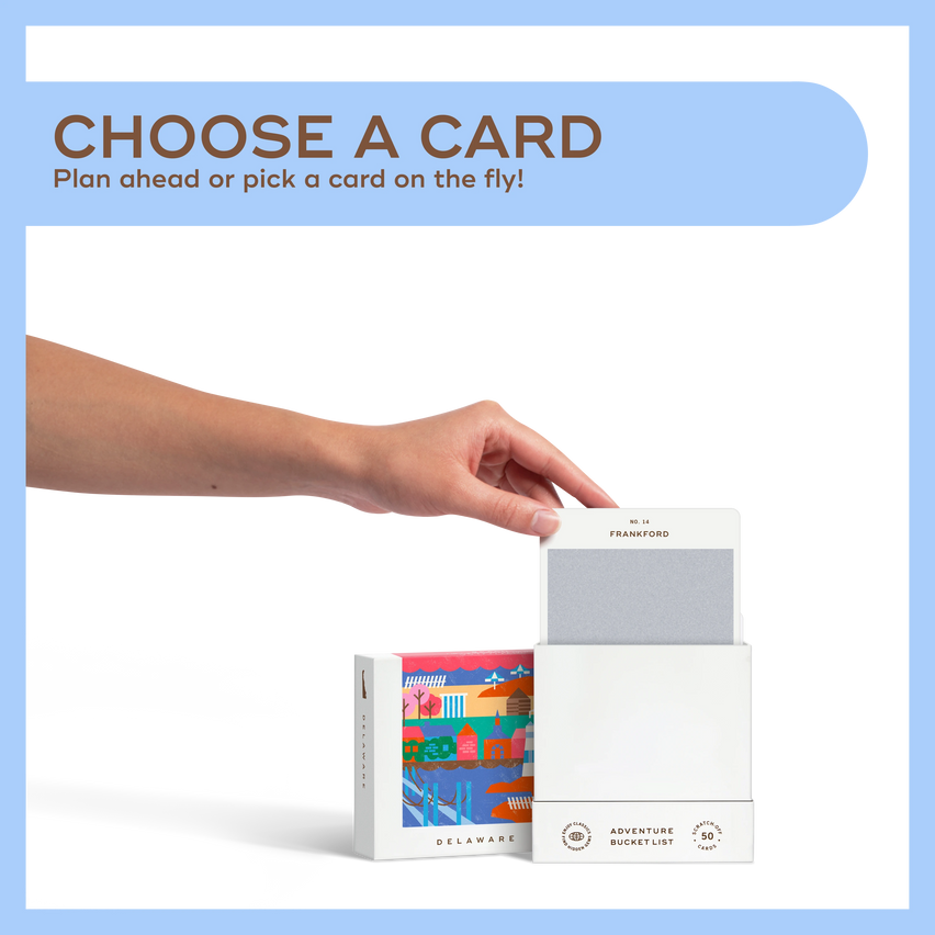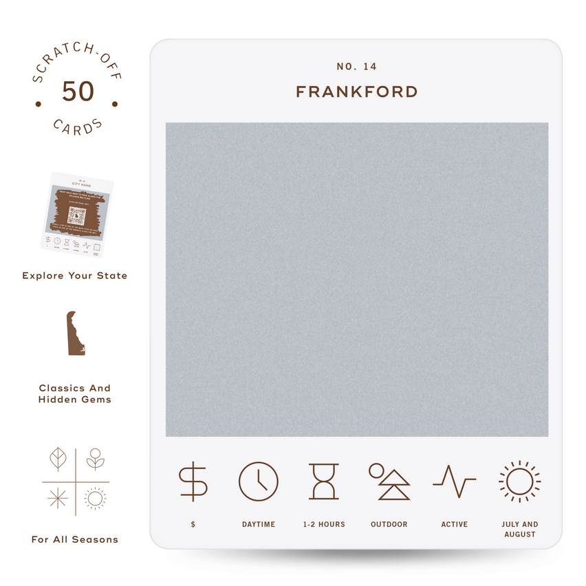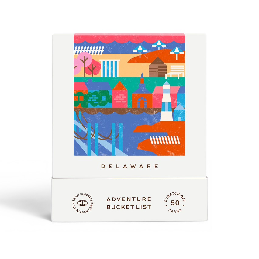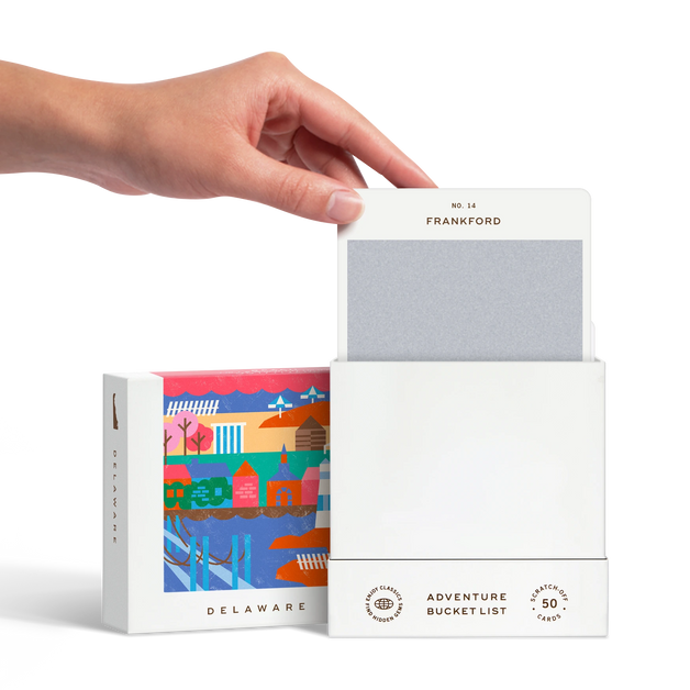 50 scratch off bucket list adventures around the state of Delaware. Pick a city that you want to explore, check out the icons at the bottom of the card to determine the season, cost, and time of day, and then scratch off the card to reveal your adventure!