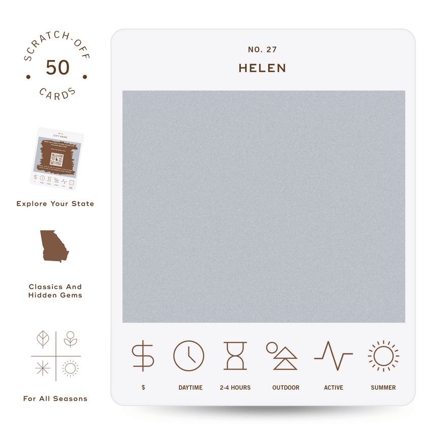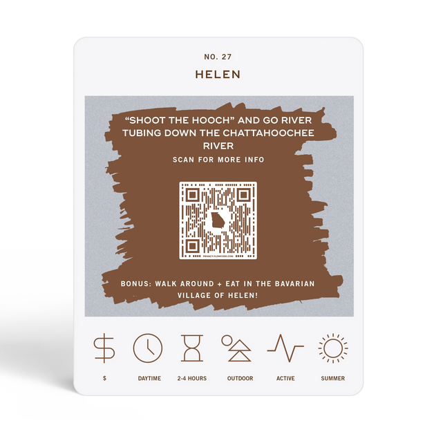 The Georgia Adventure Bucket List is a deck of 50 cards, each featuring a unique adventure within the state. Each card is labeled with the name of a city or county to indicate where the adventure takes place. At the bottom of each card, there are icons that provide additional details about the adventure, including its price range, duration, recommended time of day, and season. To discover the adventure, simply scratch off the card. If you want more information about the activity, scan the QR code on the card with your phone. This will take you to a website where you can learn more about the adventure and get tips on how to make the most of your experience.