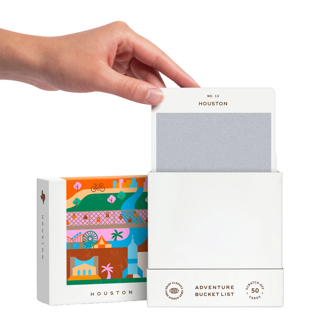 50 scratch-off bucket list adventures in & around the Houston Metro, TX. Pick an area that you want to explore, check out the icons at the bottom of the card to determine the season, cost, and time of day, and then scratch off the card to reveal your adventure!