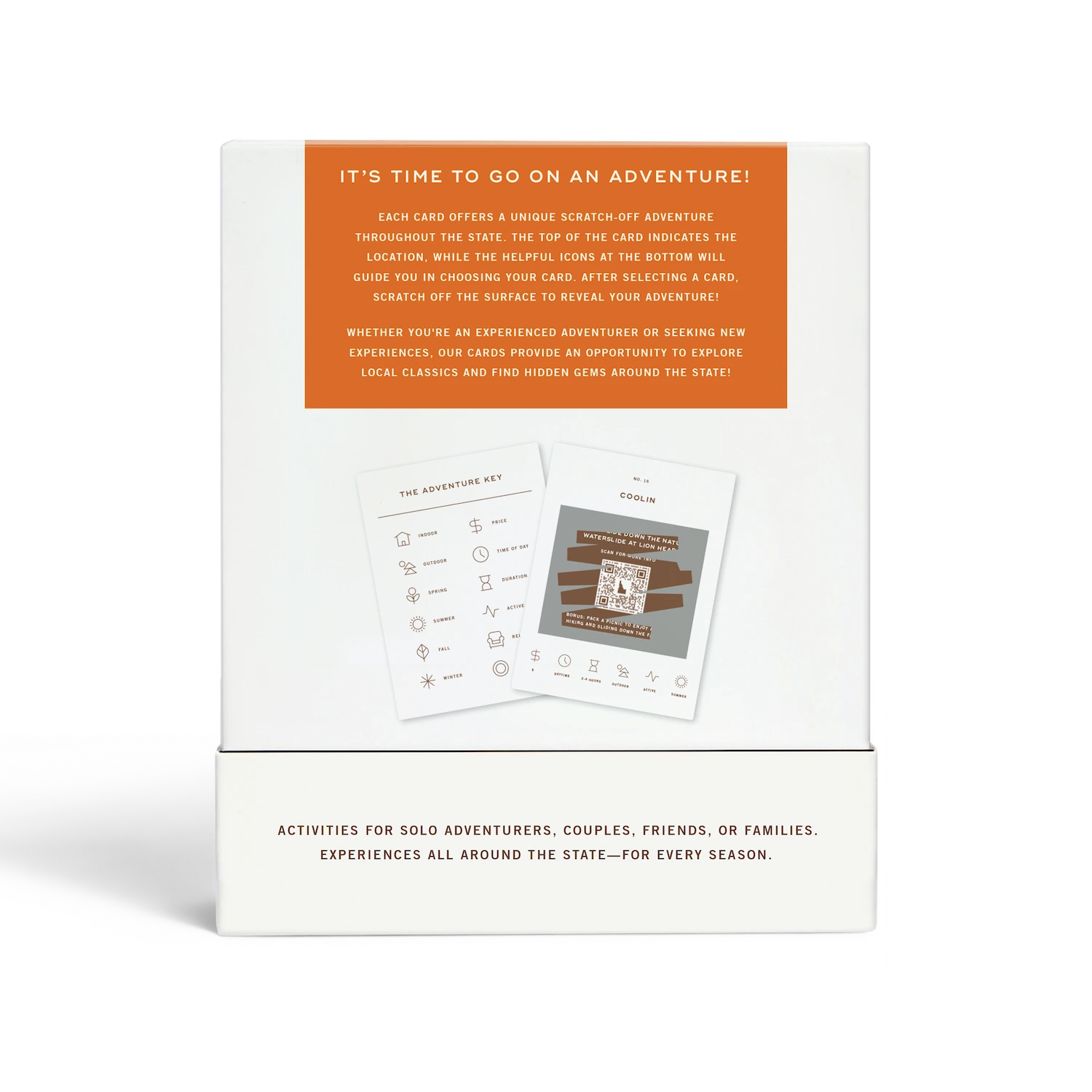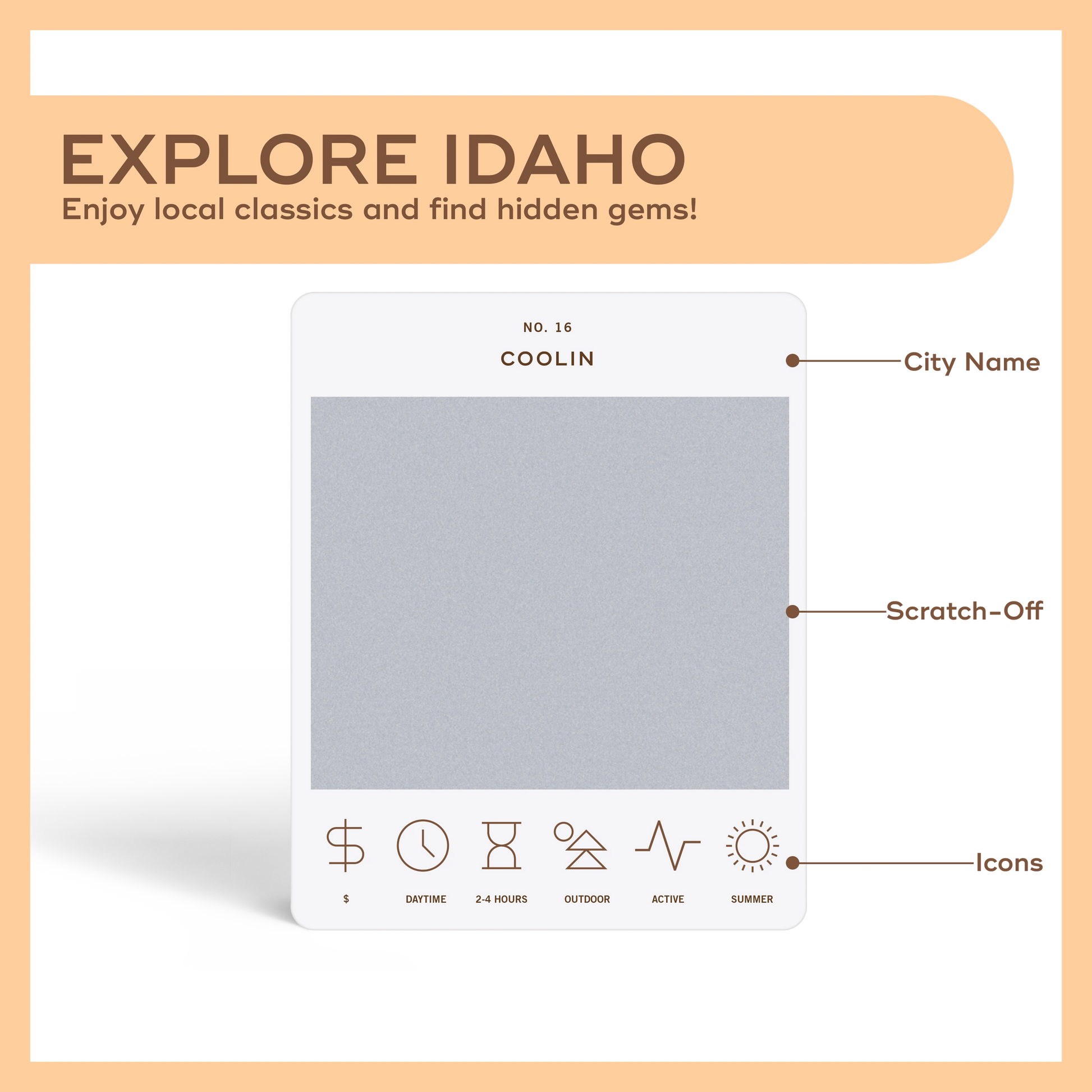 50 scratch off bucket list adventures around the state of Idaho. Pick a city that you want to explore, check out the icons at the bottom of the card to determine the season, cost, and time of day, and then scratch off the card to reveal your adventure!