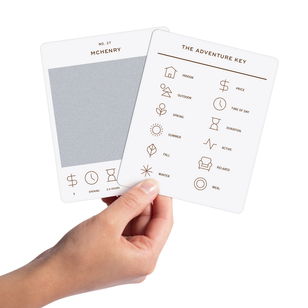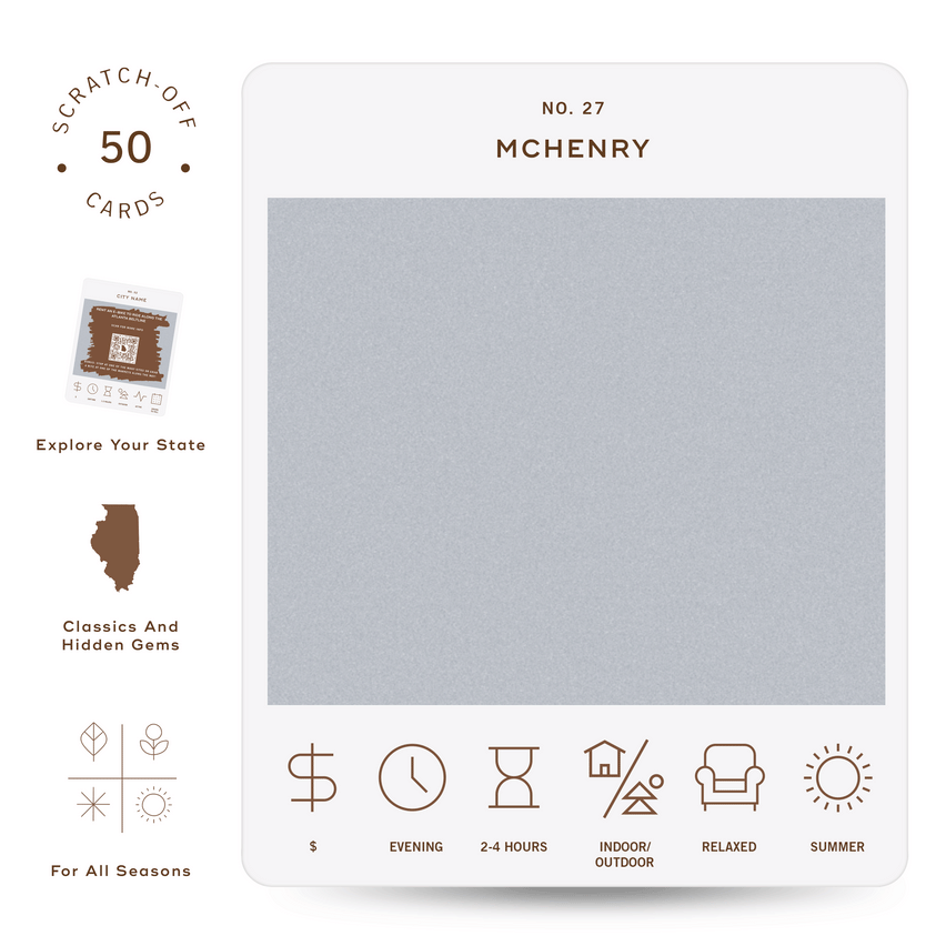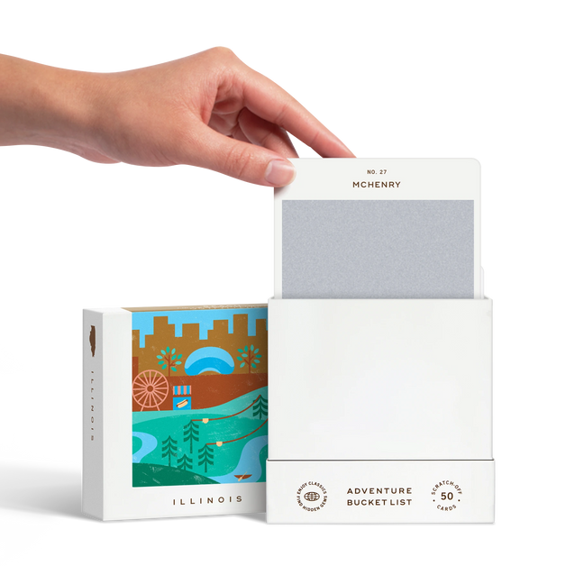 50 scratch off bucket list adventures around the state of Illinois. Pick a city that you want to explore, check out the icons at the bottom of the card to determine the season, cost, and time of day, and then scratch off the card to reveal your adventure!