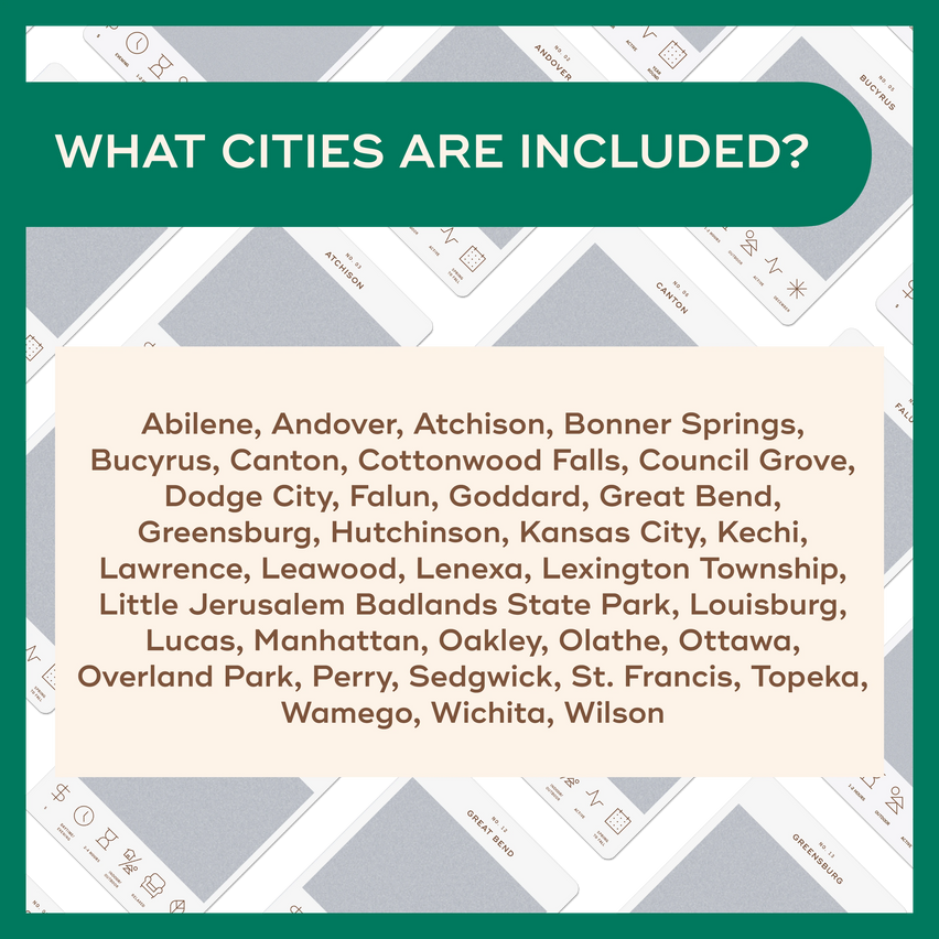 Abilene, Andover, Atchison, Bonner Springs, Bucyrus, Canton, Cottonwood Falls, Council Grove, Dodge City, Falun, Goddard, Great Bend, Greensburg, Hutchinson, Kansas City, Kechi, Lawrence, Leawood, Lenexa, Lexington Township, Little Jerusalem Badlands State Park, Louisburg, Lucas, Manhattan, Oakley, Olathe, Ottawa, Overland Park, Perry, Sedgwick, St. Francis, Topeka, Wamego, Wichita, and Wilson. We don't have a card for every city, but we did try to get a wide variety!