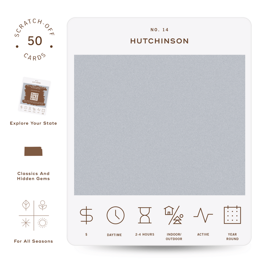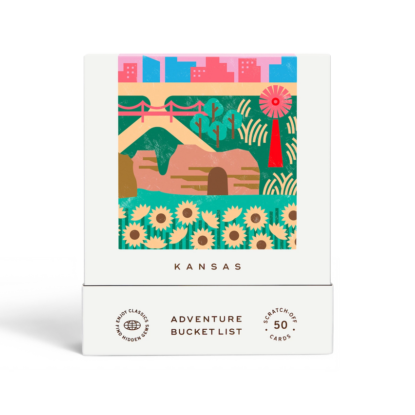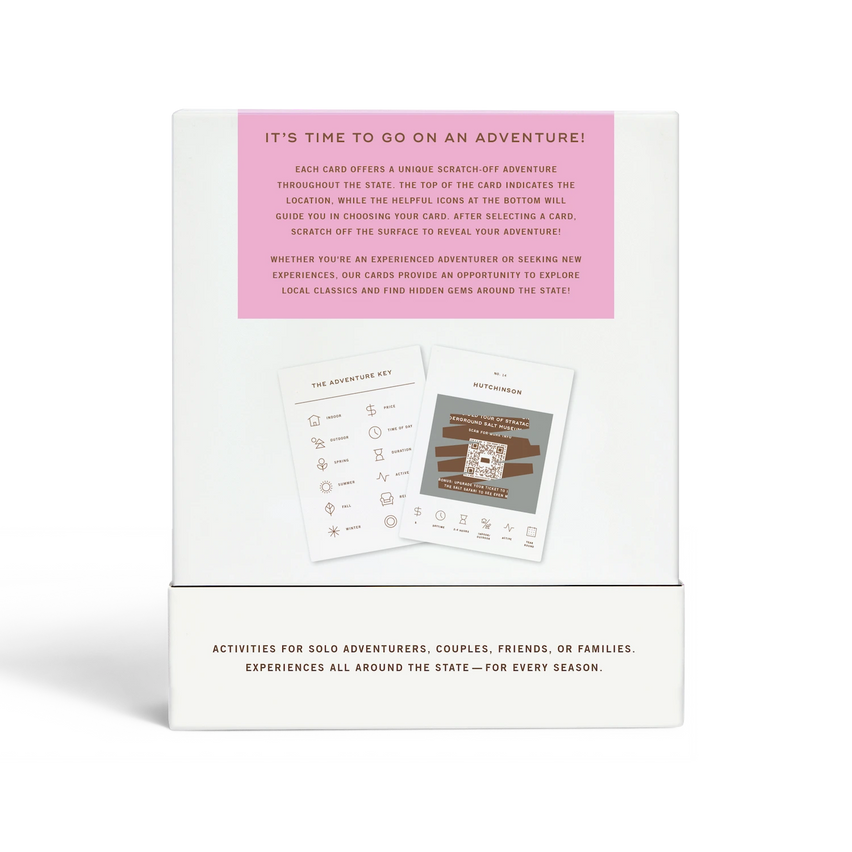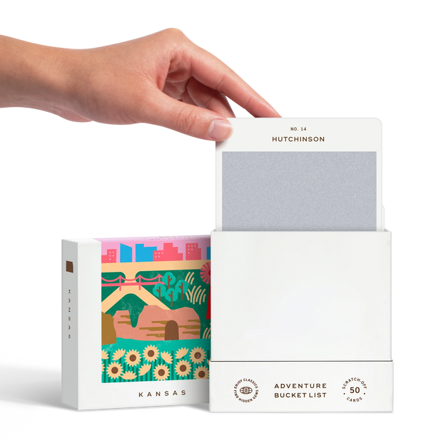 50 scratch off bucket list adventures around the state of Kansas. Pick a city that you want to explore, check out the icons at the bottom of the card to determine the season, cost, and time of day, and then scratch off the card to reveal your adventure!