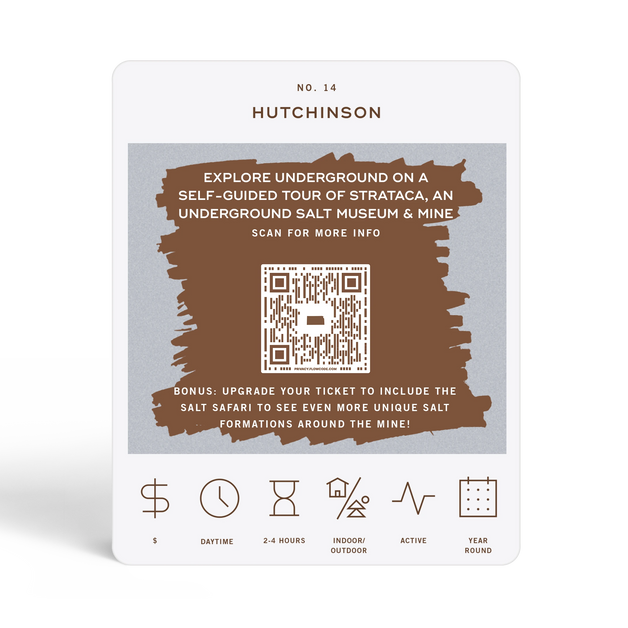 The Kansas Adventure Bucket List is a deck of 50 cards, each featuring a unique adventure within the state. Each card is labeled with the name of a city or county to indicate where the adventure takes place. At the bottom of each card, there are icons that provide additional details about the adventure, including its price range, duration, recommended time of day, and season. To discover the adventure, simply scratch off the card. If you want more information about the activity, scan the QR code on the card with your phone. This will take you to a website where you can learn more about the adventure and get tips on how to make the most of your experience.