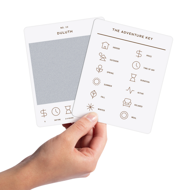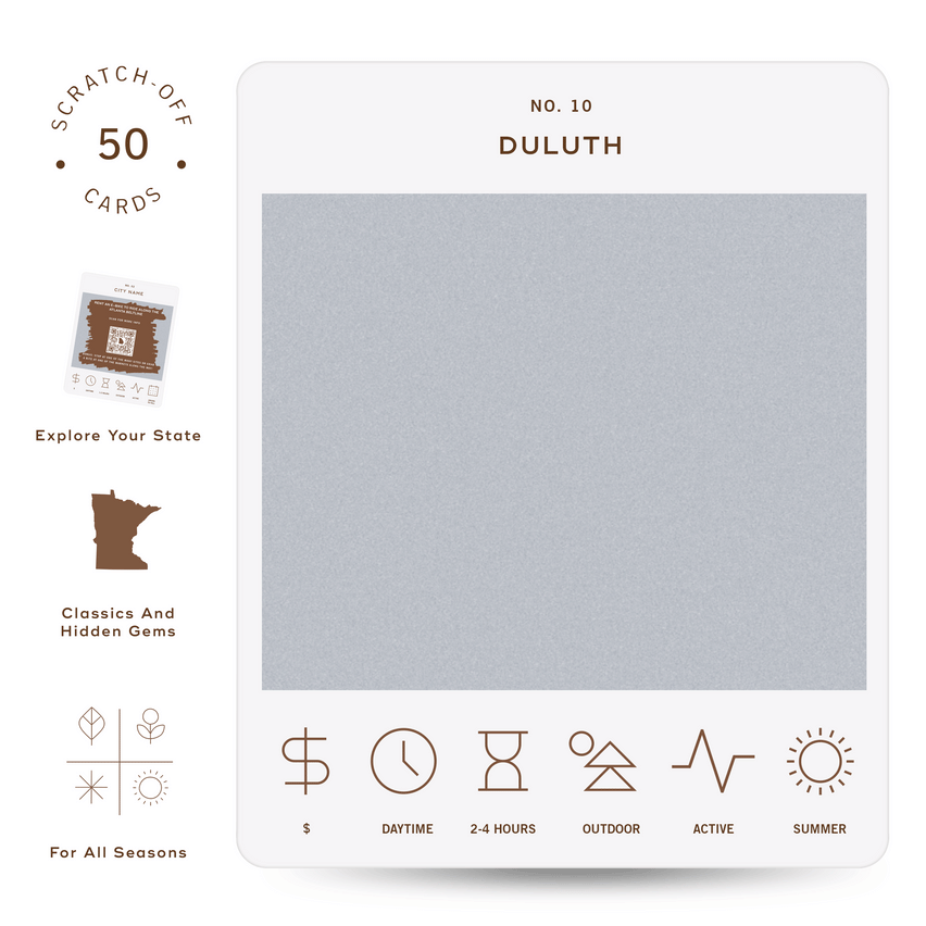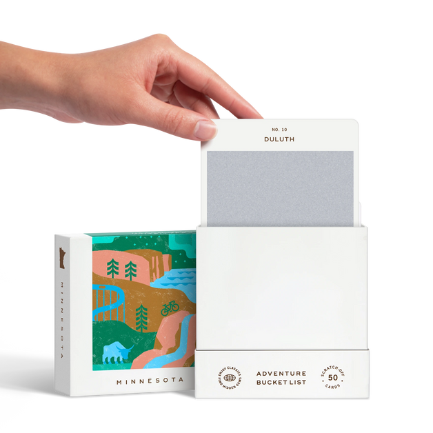 50 scratch off bucket list adventures around the state of Minnesota. Pick a city that you want to explore, check out the icons at the bottom of the card to determine the season, cost, and time of day, and then scratch off the card to reveal your adventure!