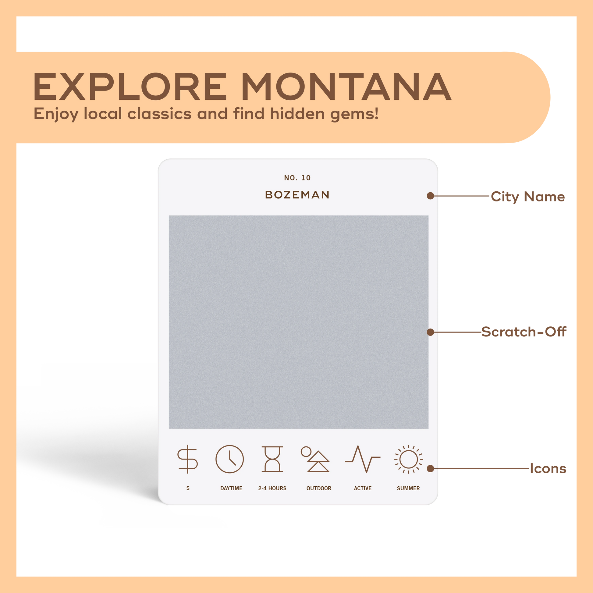 50 scratch off bucket list adventures around the state of Montana. Pick a city that you want to explore, check out the icons at the bottom of the card to determine the season, cost, and time of day, and then scratch off the card to reveal your adventure!