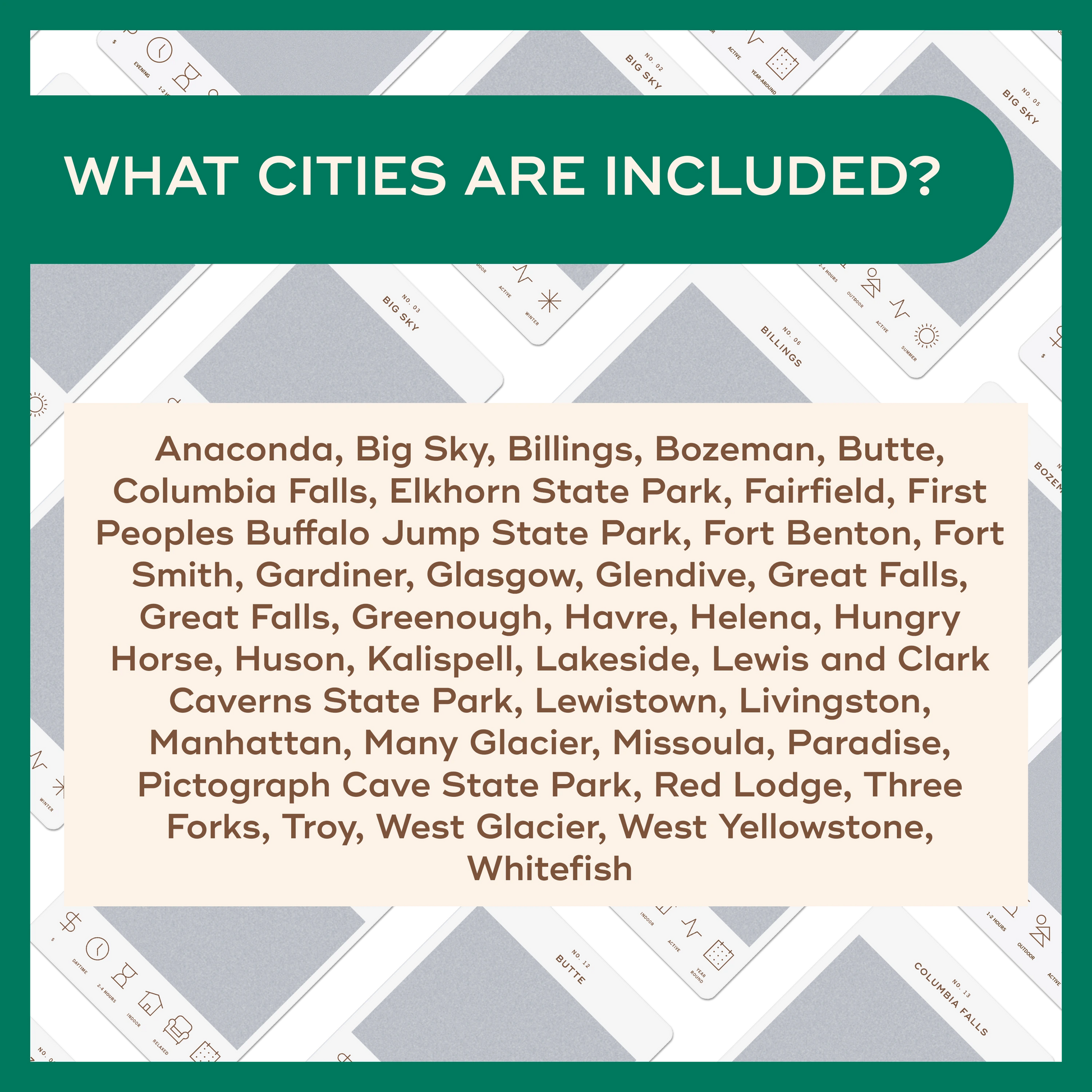 Anaconda, Big Sky, Billings, Bozeman, Butte, Columbia Falls, Elkhorn State Park, Fairfield, First Peoples Buffalo Jump State Park, Fort Benton, Fort Smith, Gardiner, Glasgow, Glendive, Great Falls, Great Falls, Greenough, Havre, Helena, Hungry Horse, Huson, Kalispell, Lakeside, Lewis and Clark Caverns State Park, Lewistown, Livingston, Manhattan, Many Glacier, Missoula, Paradise, Pictograph Cave State Park, Red Lodge, Three Forks, Troy, West Glacier, West Yellowstone, and Whitefish. We don't have a card for every city, but we did try to get a wide variety!