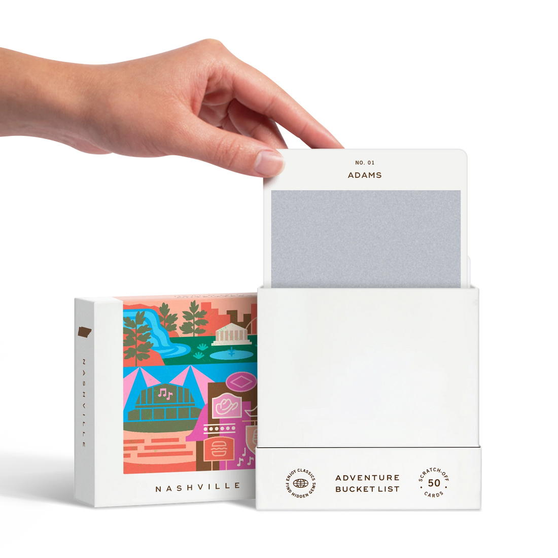 50 scratch-off bucket list adventures in & around the city of Nashville. Pick an area of the city that you want to explore, check out the icons at the bottom of the card to determine the season, cost, and time of day, and then scratch off the card to reveal your adventure!