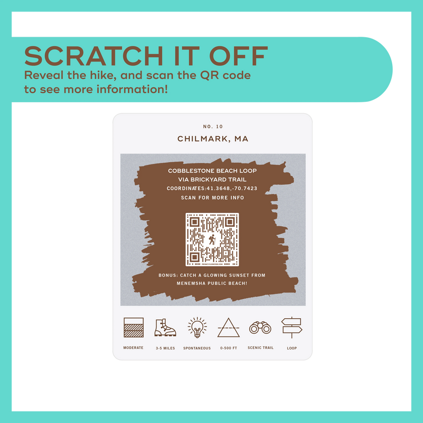 To reveal the hike, just scratch off the foil. Want more info before you go? Scan the QR code on the card with your phone to unlock trail details, directions, tips, and nearby bonus stops on our website. It’s the perfect blend of mystery, planning, and adventure.