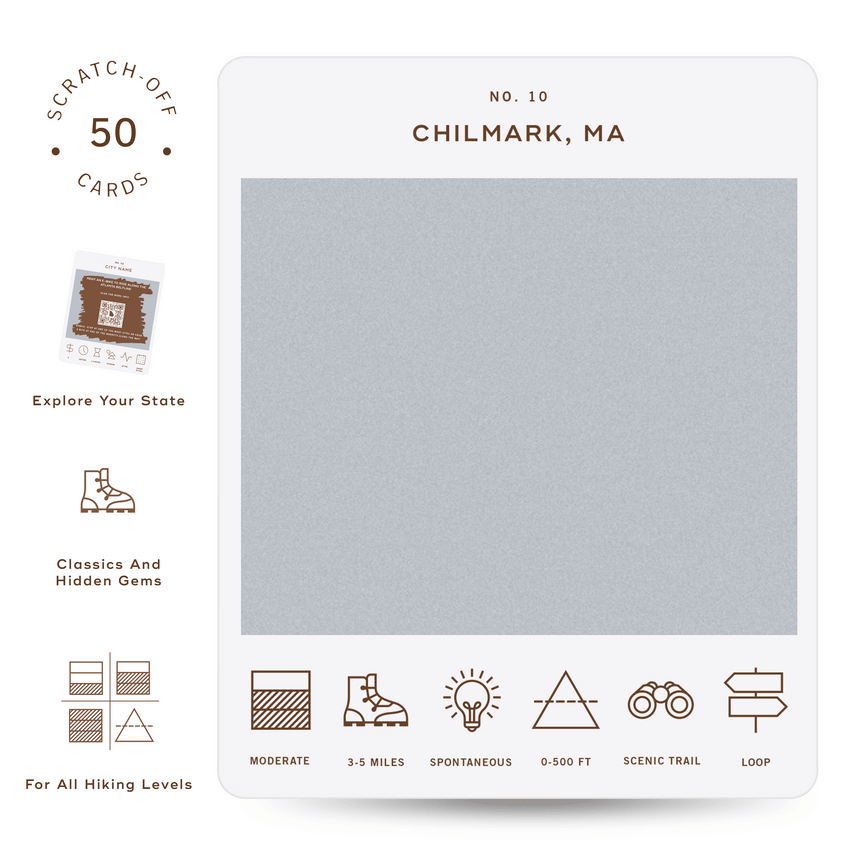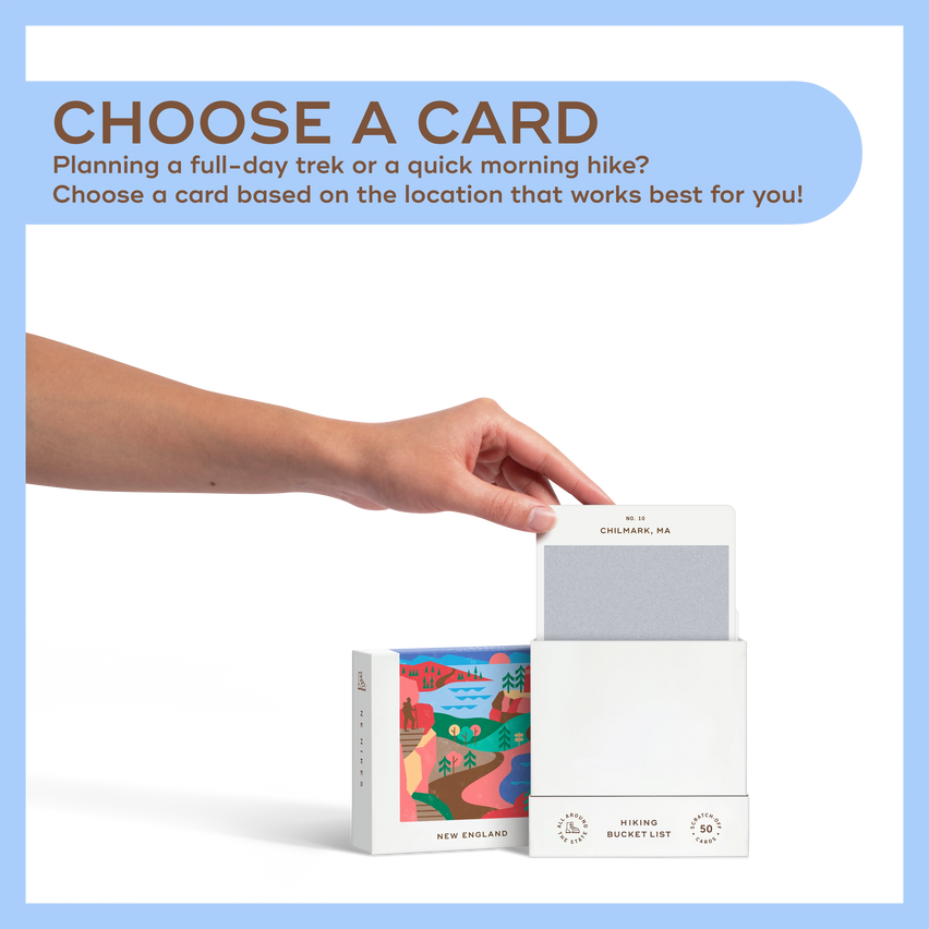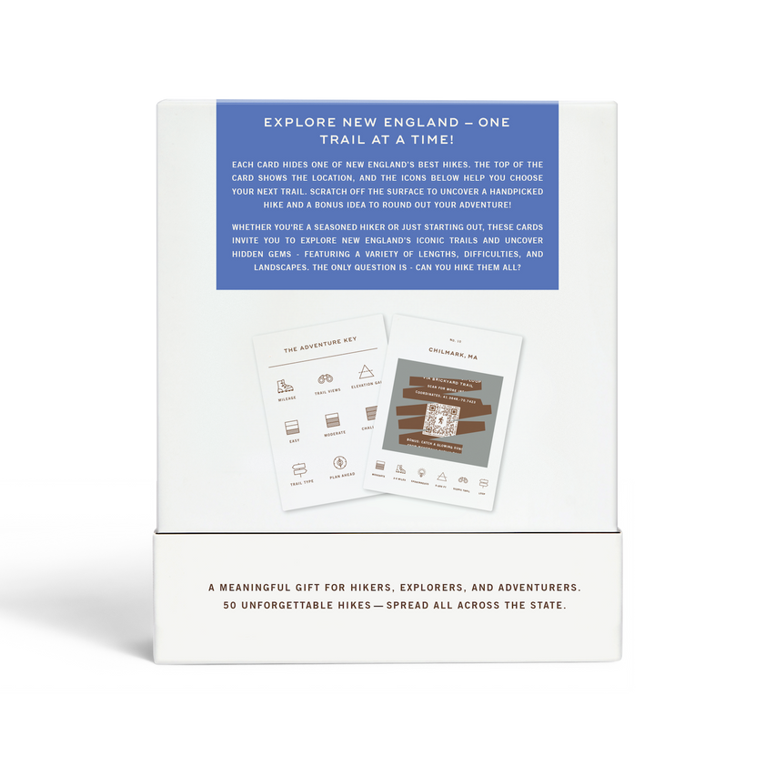 Discover 50 unforgettable hikes across the mountains, valleys, forests, and canyons of New England. Whether you’re chasing panoramic views, alpine lakes, or rugged switchbacks, this scratch-off hiking challenge helps you explore the most scenic trails the region has to offer. Each card gives you just enough info to plan ahead—or embrace the unknown. Scratch to reveal your hike, lace up your boots, and hit the trail! Use the icons at the bottom of each card to quickly gauge difficulty, distance, elevation gain, trail type, and how much planning you'll need. Each hike also includes a QR code that links to full trail details, maps, and any real-time updates.