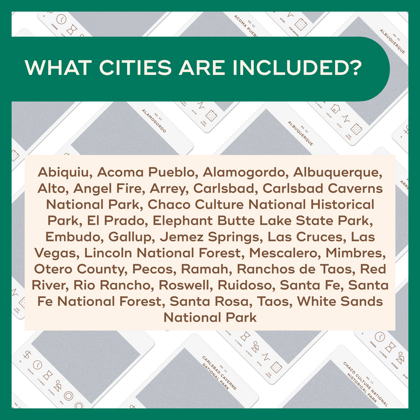 Abiquiu, Acoma Pueblo, Alamogordo, Albuquerque, Alto, Angel Fire, Arrey, Carlsbad, Carlsbad Caverns National Park, Chaco Culture National Historical Park, El Prado, Elephant Butte Lake State Park, Embudo, Gallup, Jemez Springs, Las Cruces, Las Vegas, Lincoln National Forest, Mescalero, Mimbres, Otero County, Pecos, Ramah, Ranchos de Taos, Red River, Rio Rancho, Roswell, Ruidoso, Santa Fe, Santa Fe National Forest, Santa Rosa, Taos, and White Sands National Park. We don't have a card for every city, but we did try to get a wide variety!