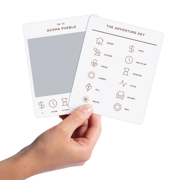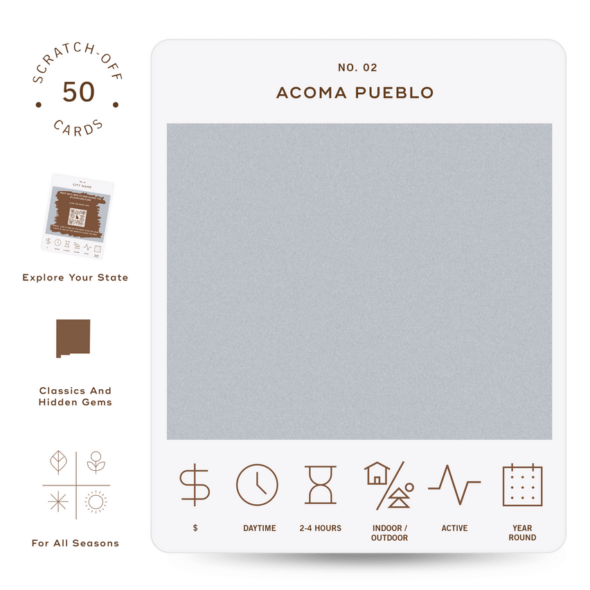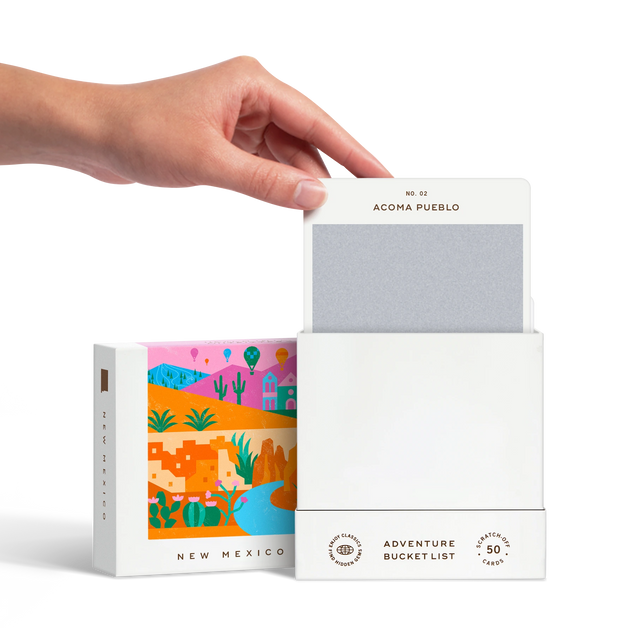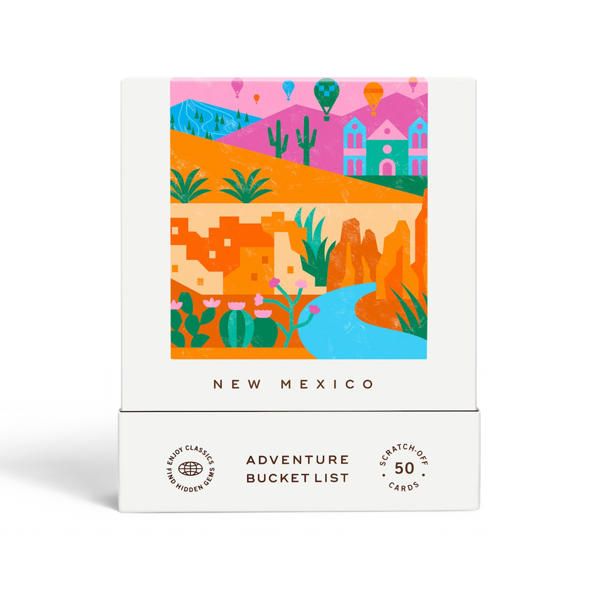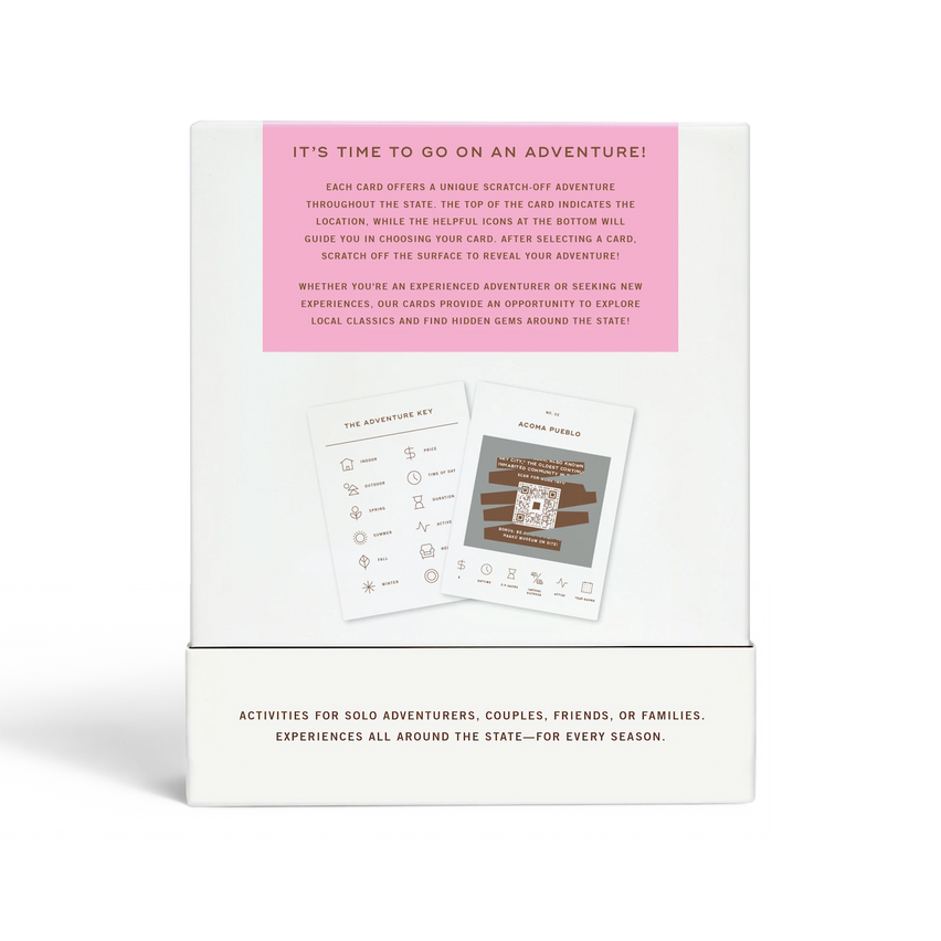 50 scratch off bucket list adventures around the state of New Mexico. Pick a city that you want to explore, check out the icons at the bottom of the card to determine the season, cost, and time of day, and then scratch off the card to reveal your adventure!