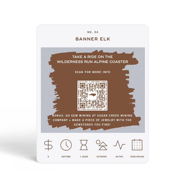 The North Carolina Adventure Bucket List is a deck of 50 cards, each featuring a unique adventure within the state. Each card is labeled with the name of a city or county to indicate where the adventure takes place. At the bottom of each card, there are icons that provide additional details about the adventure, including its price range, duration, recommended time of day, and season. To discover the adventure, simply scratch off the card. If you want more information about the activity, scan the QR code on the card with your phone. This will take you to a website where you can learn more about the adventure and get tips on how to make the most of your experience.