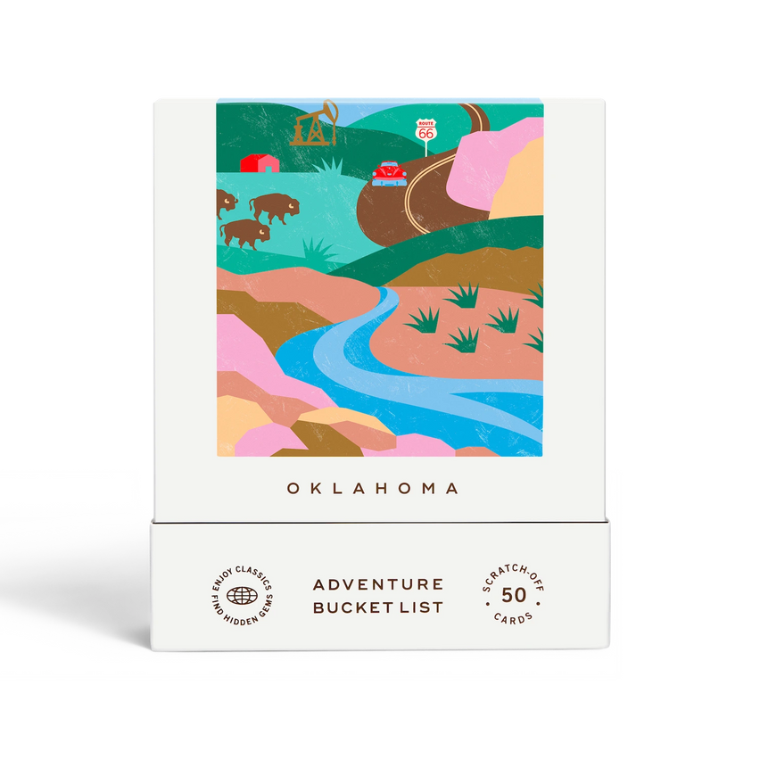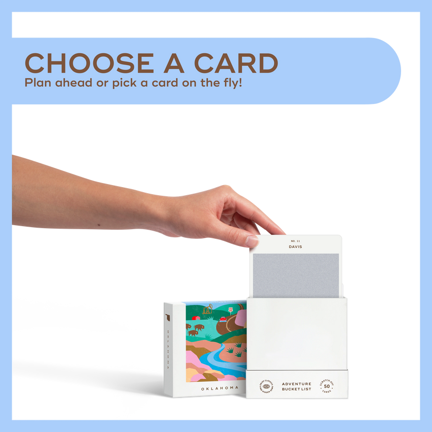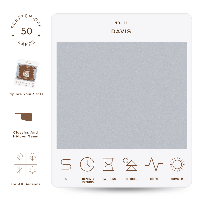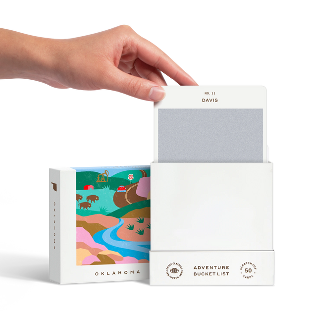 50 scratch off bucket list adventures around the state of Oklahoma. Pick a city that you want to explore, check out the icons at the bottom of the card to determine the season, cost, and time of day, and then scratch off the card to reveal your adventure!
