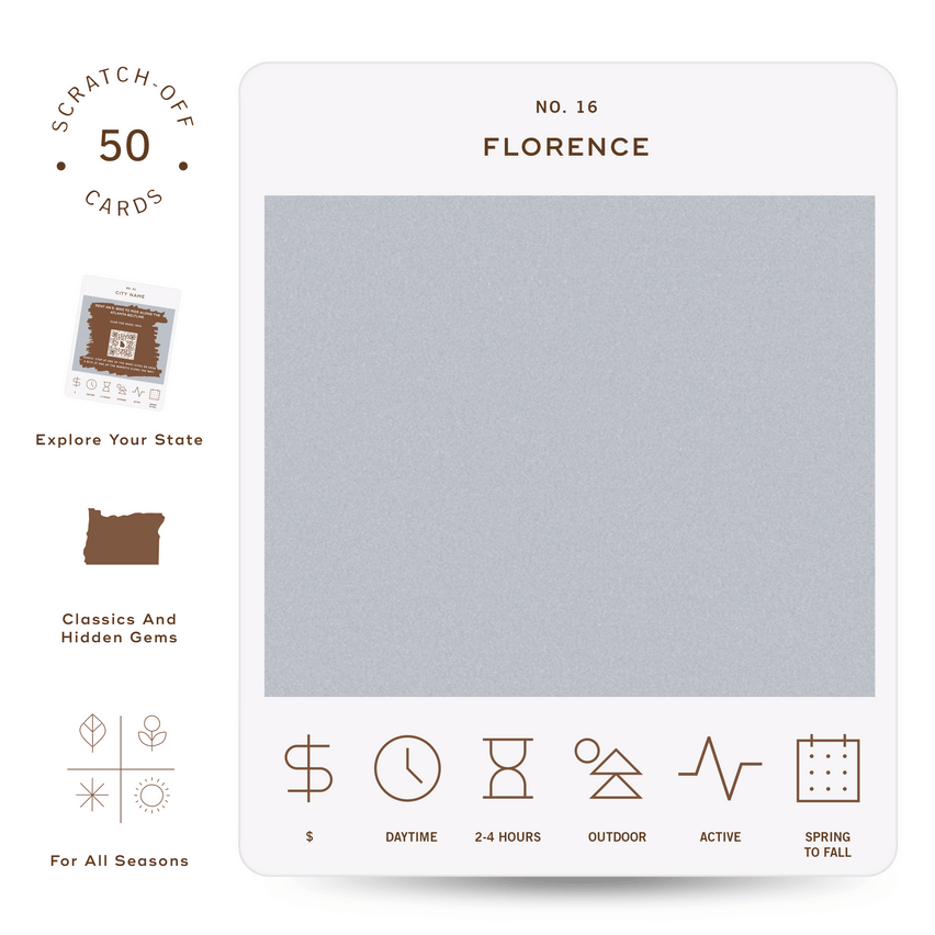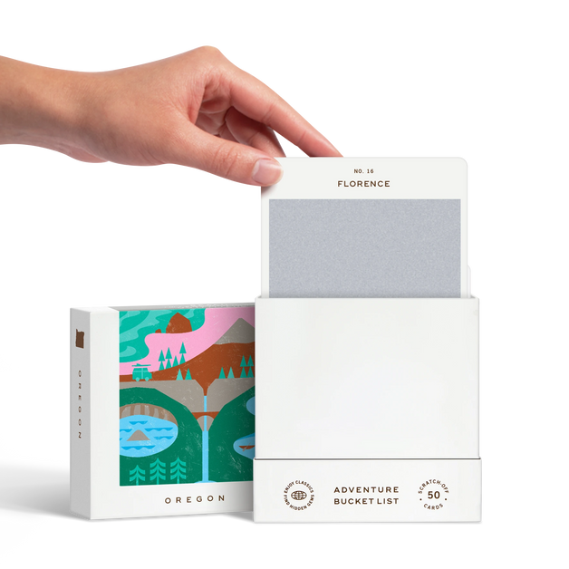 50 scratch off bucket list adventures around the state of Oregon. Pick a city that you want to explore, check out the icons at the bottom of the card to determine the season, cost, and time of day, and then scratch off the card to reveal your adventure!