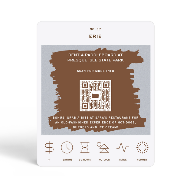 The Pennsylvania Adventure Bucket List is a deck of 50 cards, each featuring a unique adventure within the state. Each card is labeled with the name of a city or county to indicate where the adventure takes place. At the bottom of each card, there are icons that provide additional details about the adventure, including its price range, duration, recommended time of day, and season. To discover the adventure, simply scratch off the card. If you want more information about the activity, scan the QR code on the card with your phone. This will take you to a website where you can learn more about the adventure and get tips on how to make the most of your experience.