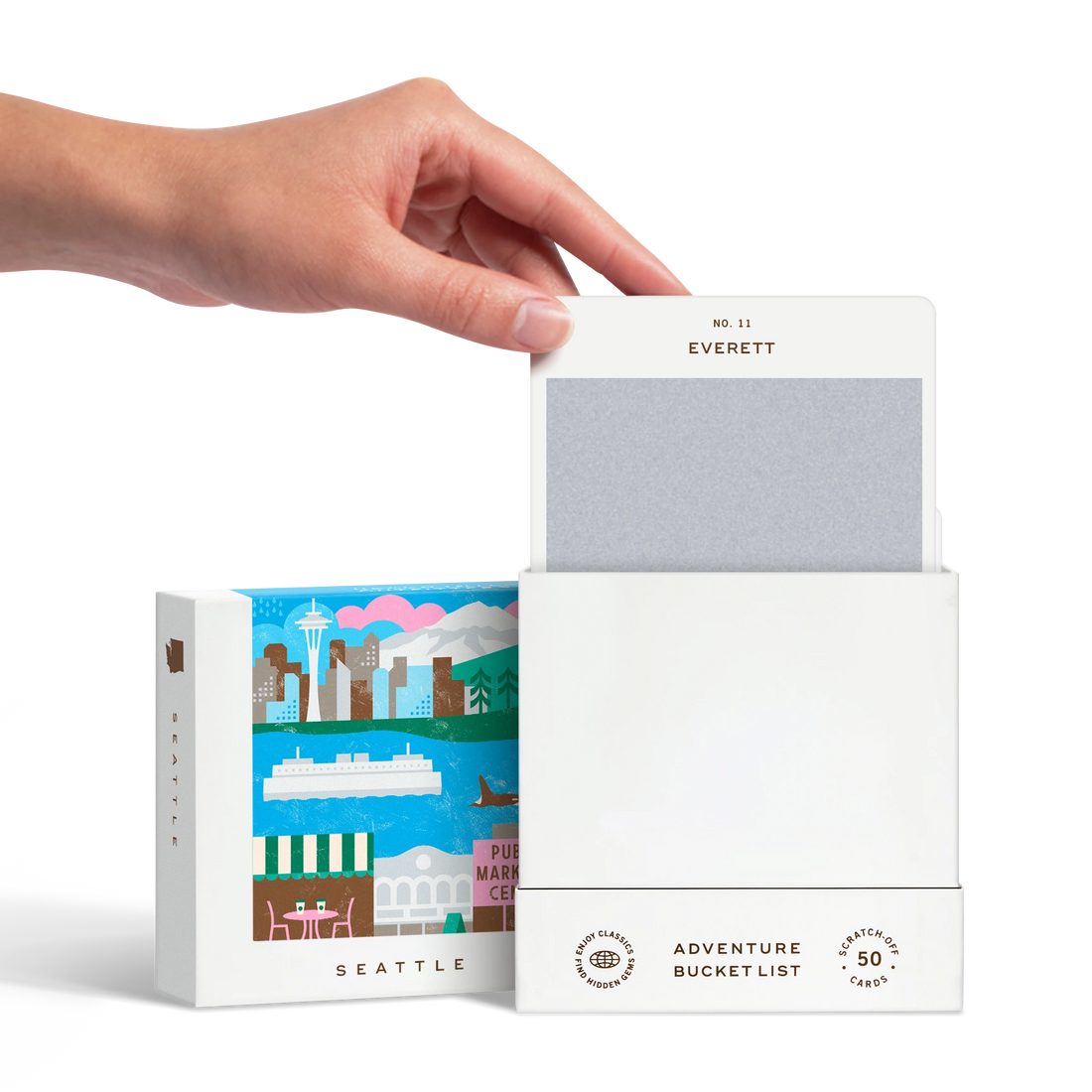 50 scratch off bucket list adventures all within one hour of the city of Seattle. Pick an area of the city that you want to explore, check out the icons at the bottom of the card to determine the season, cost, and time of day, and then scratch off the card to reveal your adventure!