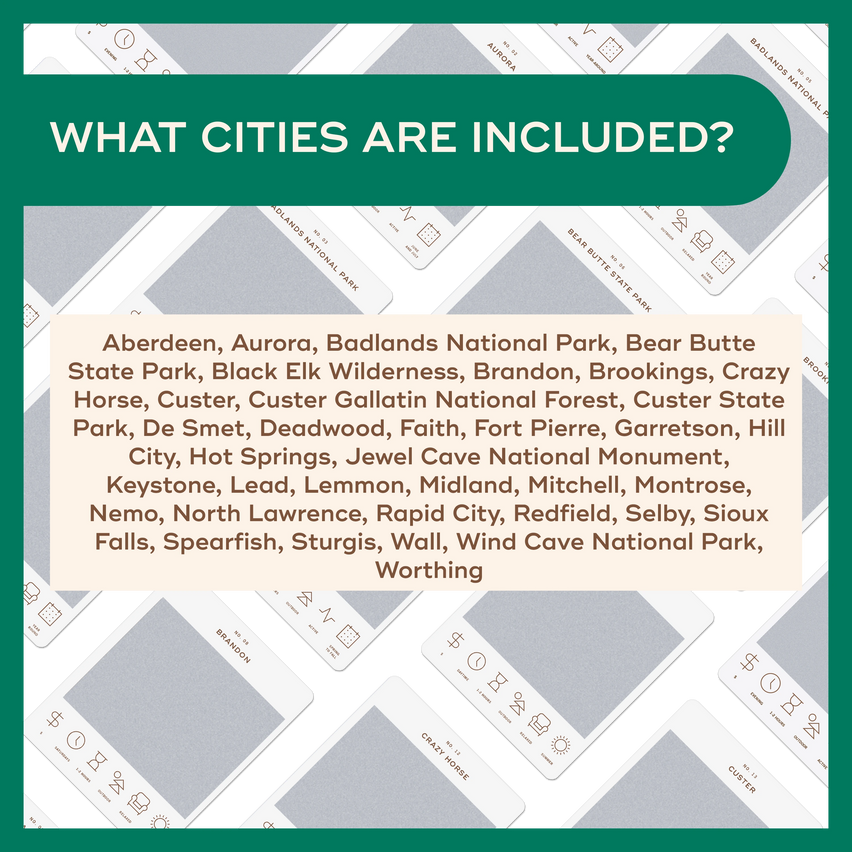 Aberdeen, Aurora, Badlands National Park, Bear Butte State Park, Black Elk Wilderness, Brandon, Brookings, Crazy Horse, Custer, Custer Gallatin National Forest, Custer State Park, De Smet, Deadwood, Faith, Fort Pierre, Garretson, Hill City, Hot Springs, Jewel Cave National Monument, Keystone, Lead, Lemmon, Midland, Mitchell, Montrose, Nemo, North Lawrence, Rapid City, Redfield, Selby, Sioux Falls, Spearfish, Sturgis, Wall, Wind Cave National Park, and Worthing. We don't have a card for every city, but we did try to get a wide variety!