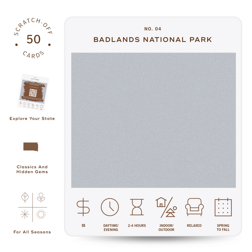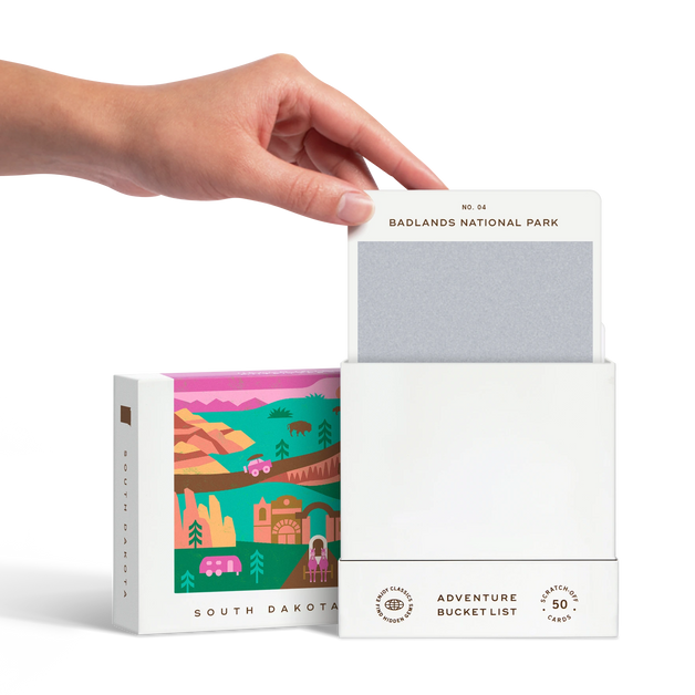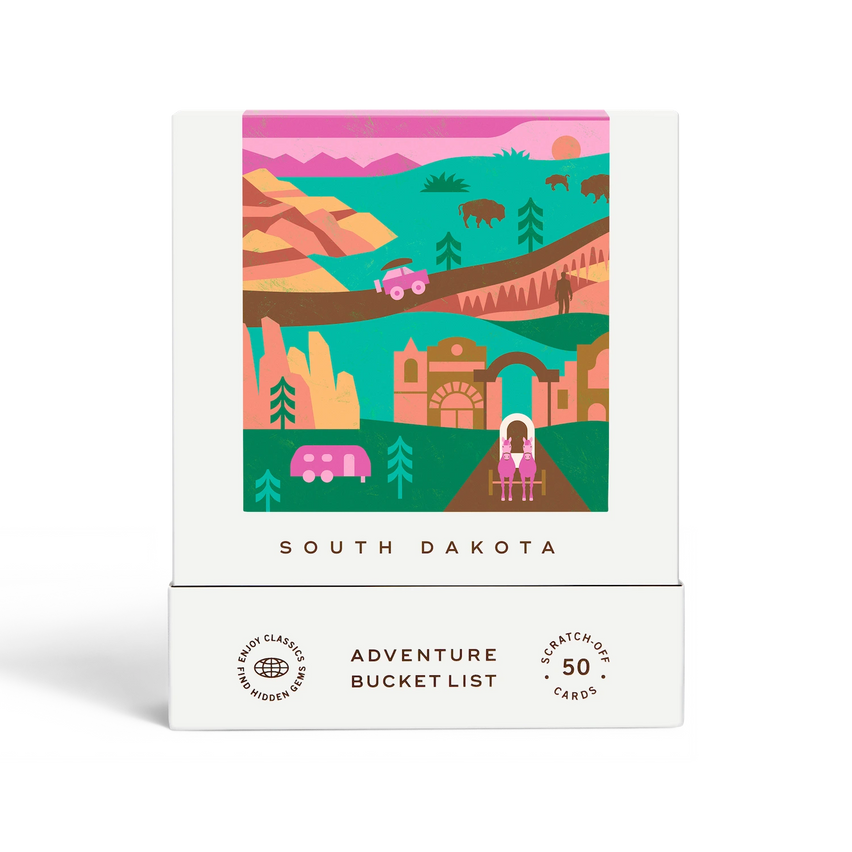 50 scratch off bucket list adventures around the state of South Dakota. Pick a city that you want to explore, check out the icons at the bottom of the card to determine the season, cost, and time of day, and then scratch off the card to reveal your adventure!