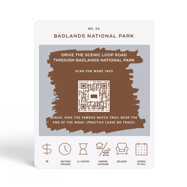 The South Dakota Adventure Bucket List is a deck of 50 cards, each featuring a unique adventure within the state. Each card is labeled with the name of a city or county to indicate where the adventure takes place. At the bottom of each card, there are icons that provide additional details about the adventure, including its price range, duration, recommended time of day, and season. To discover the adventure, simply scratch off the card. If you want more information about the activity, scan the QR code on the card with your phone. This will take you to a website where you can learn more about the adventure and get tips on how to make the most of your experience.