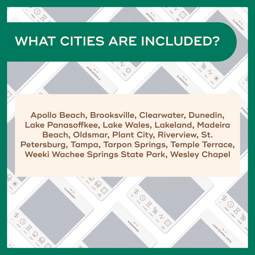 50 scratch off bucket list adventures all within one hour of the city of Tampa Bay. Pick an area of the city that you want to explore, check out the icons at the bottom of the card to determine the season, cost, and time of day, and then scratch off the card to reveal your adventure!