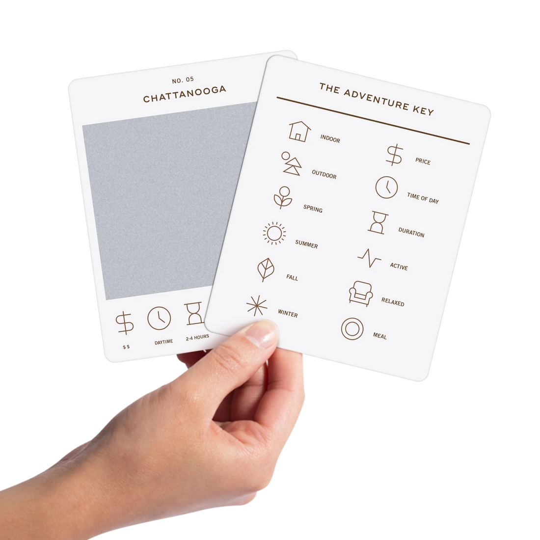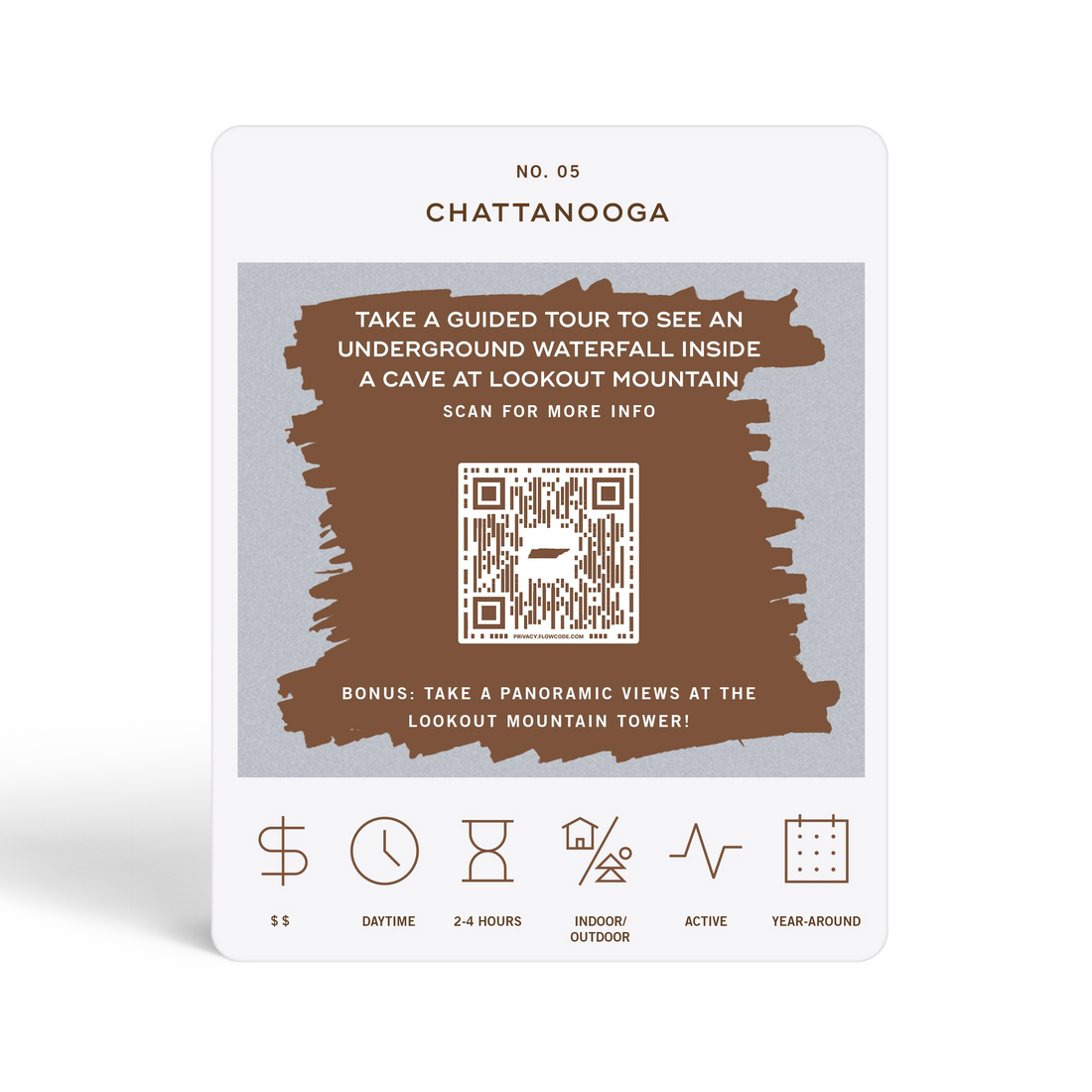 The Tennessee Adventure Bucket List is a deck of 50 cards, each featuring a unique adventure within the state. Each card is labeled with the name of a city or county to indicate where the adventure takes place. At the bottom of each card, there are icons that provide additional details about the adventure, including its price range, duration, recommended time of day, and season. To discover the adventure, simply scratch off the card. If you want more information about the activity, scan the QR code on the card with your phone. This will take you to a website where you can learn more about the adventure and get tips on how to make the most of your experience.