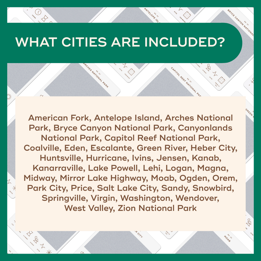 American Fork, Antelope Island, Arches National Park, Bryce Canyon National Park, Canyonlands National Park, Capitol Reef National Park, Coalville, Eden, Escalante, Green River, Heber City, Huntsville, Hurricane, Ivins, Jensen, Kanab, Kanarraville, Lake Powell, Lehi, Logan, Magna, Midway, Mirror Lake Highway, Moab, Ogden, Orem, Park City, Price, Salt Lake City, Sandy, Snowbird, Springville, Virgin, Washington, Wendover, West Valley, and Zion National Park. We don't have a card for every city, but we did try to get a wide variety!