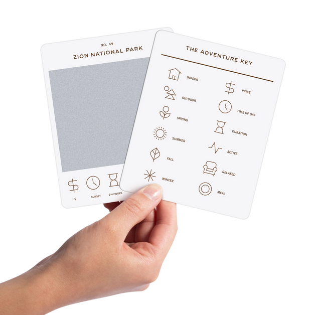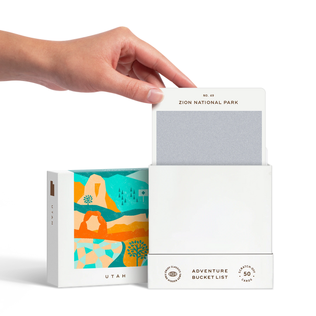 50 scratch off bucket list adventures around the state of Utah. Pick a city that you want to explore, check out the icons at the bottom of the card to determine the season, cost, and time of day, and then scratch off the card to reveal your adventure!