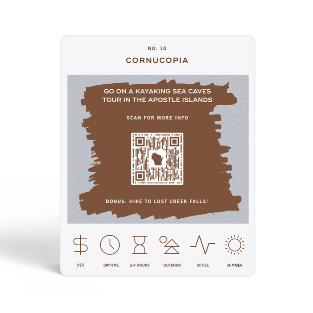 The Wisconsin Adventure Bucket List is a deck of 50 cards, each featuring a unique adventure within the state. Each card is labeled with the name of a city or county to indicate where the adventure takes place. At the bottom of each card, there are icons that provide additional details about the adventure, including its price range, duration, recommended time of day, and season. To discover the adventure, simply scratch off the card. If you want more information about the activity, scan the QR code on the card with your phone. This will take you to a website where you can learn more about the adventure and get tips on how to make the most of your experience.
