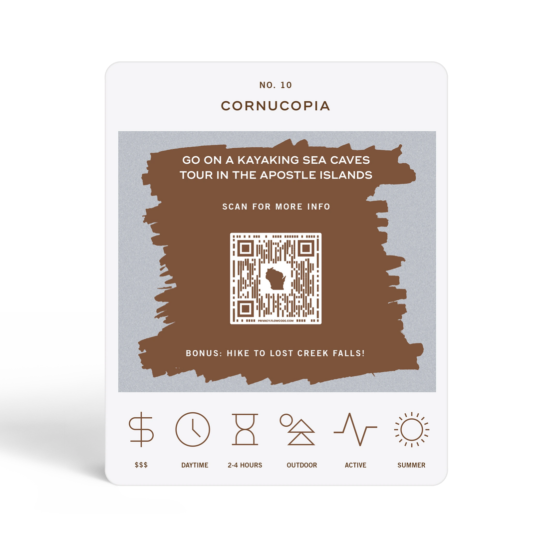 The Wisconsin Adventure Bucket List is a deck of 50 cards, each featuring a unique adventure within the state. Each card is labeled with the name of a city or county to indicate where the adventure takes place. At the bottom of each card, there are icons that provide additional details about the adventure, including its price range, duration, recommended time of day, and season. To discover the adventure, simply scratch off the card. If you want more information about the activity, scan the QR code on the card with your phone. This will take you to a website where you can learn more about the adventure and get tips on how to make the most of your experience.