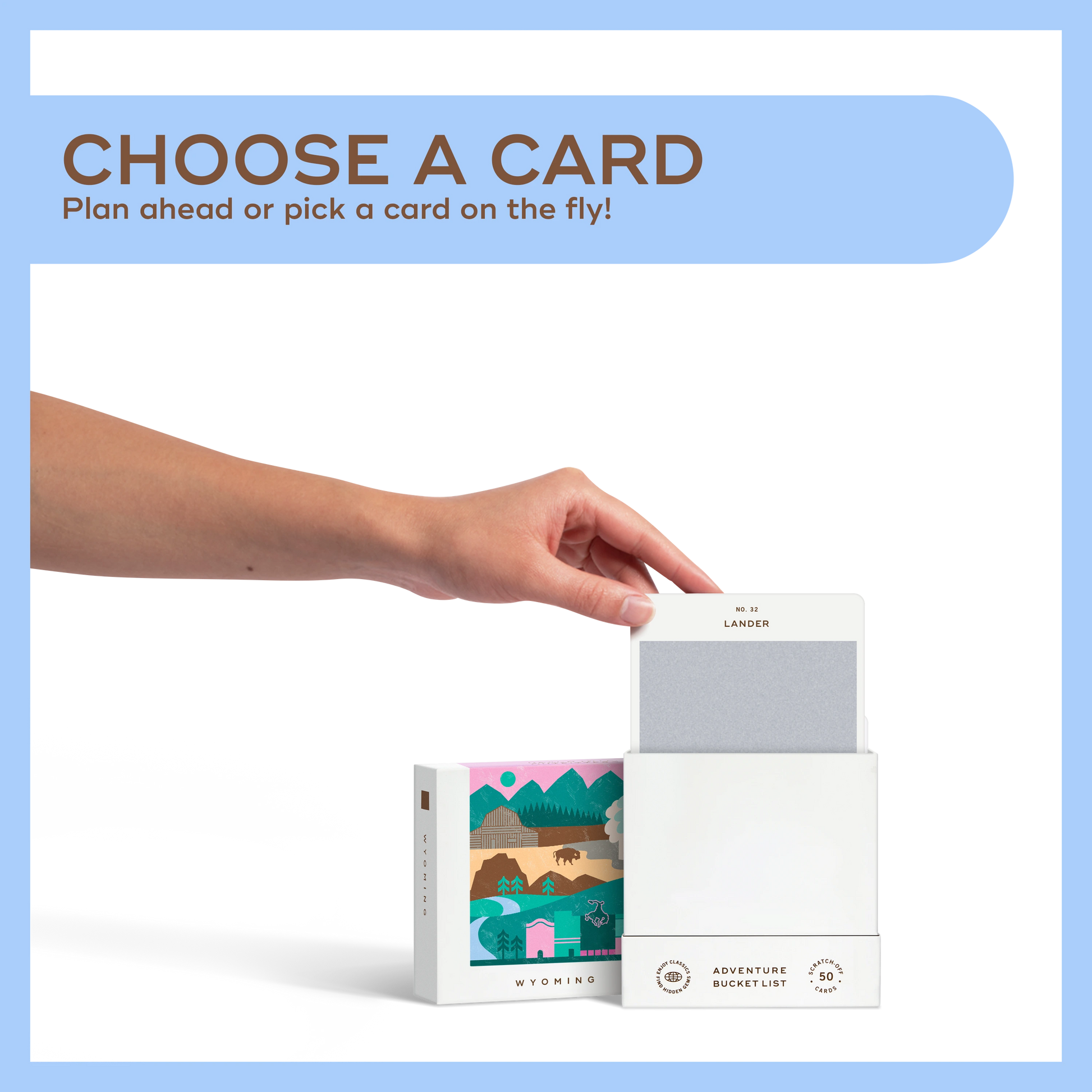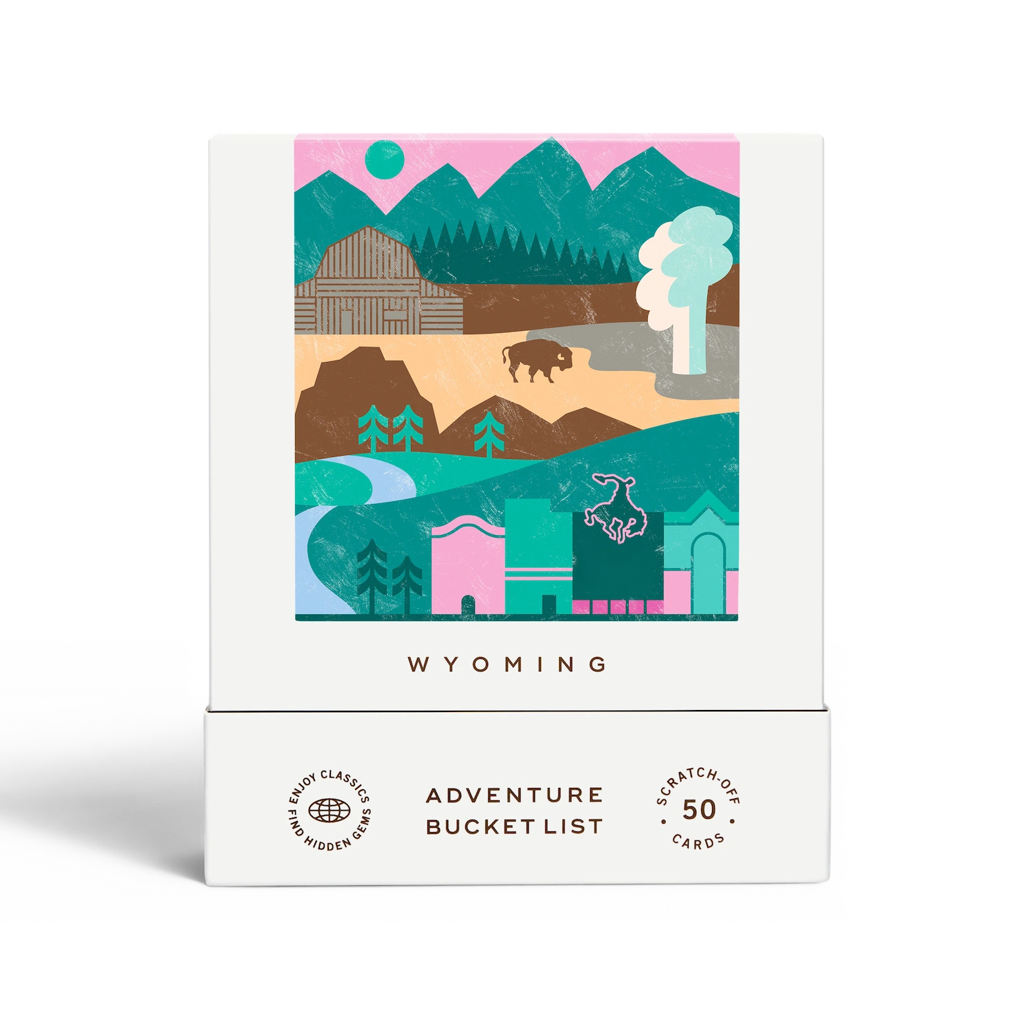 50 scratch off bucket list adventures around the state of Wyoming. Pick a city that you want to explore, check out the icons at the bottom of the card to determine the season, cost, and time of day, and then scratch off the card to reveal your adventure!
