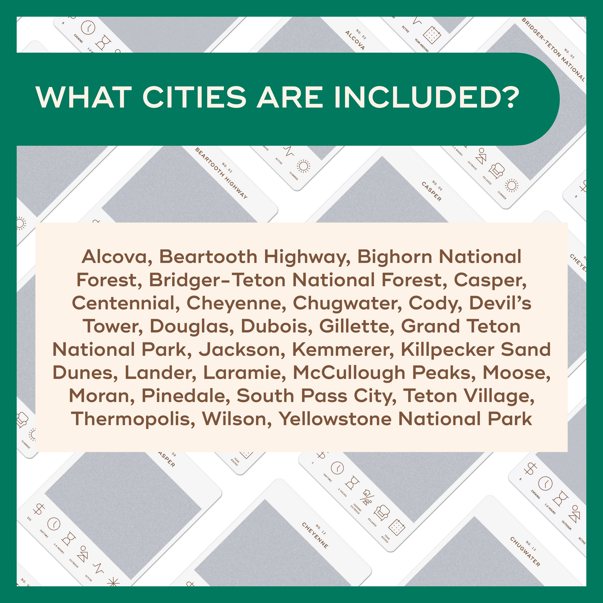Alcova, Beartooth Highway, Bighorn National Forest, Bridger-Teton National Forest, Casper, Centennial, Cheyenne, Chugwater, Cody, Devil's Tower, Douglas, Dubois, Gillette, Grand Teton National Park, Jackson, Kemmerer, Killpecker Sand Dunes, Lander, Laramie, McCullough Peaks, Moose, Moran, Pinedale, South Pass City, Teton Village, Thermopolis, Wilson, Yellowstone National Park. We don't have a card for every city, but we did try to get a wide variety!